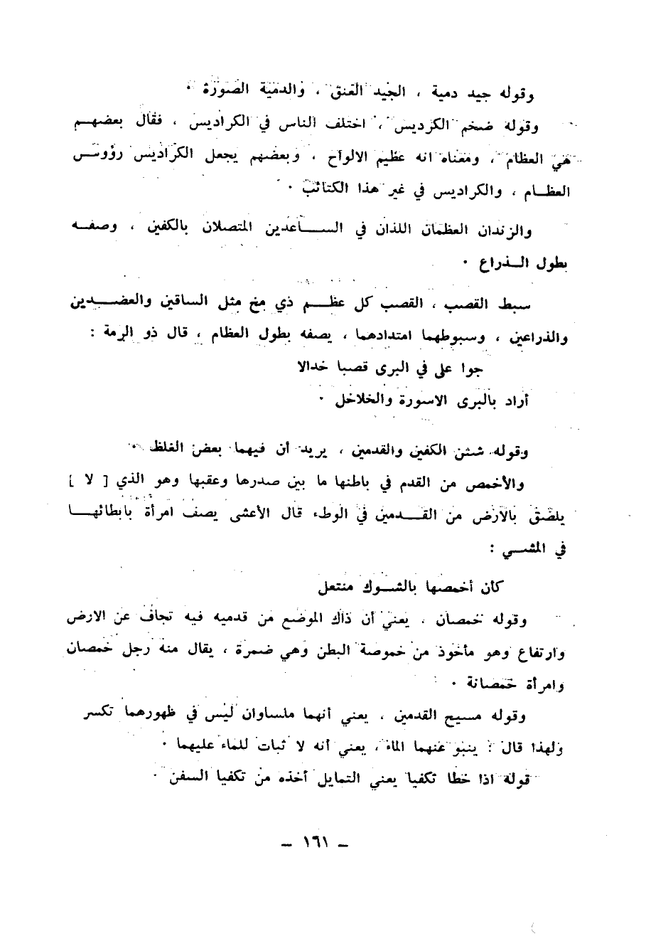 وَقَوْلُهُ: جِيدٌ دُمِيَةْ: الْجِيدُ الْعُنُقُ، وَالدُّمْيَةُ: الصُّورَةُ، وَقَوْلُهُ: ضَخْمُ الْكَرَادِيسِ: اخْتَلَفَ النَّاسُ فِي الْكَرَادِيسِ فَقَالَ بَعْضُهُمُ: هِيَ الْعِظَامُ، وَمَعْنَاهُ أَنَّهُ عَظِيمُ الْأَلْوَاحِ وَبَعْضُهُمْ يَجْعَلُ الْكَرَادِيسَ رُءُوسَ الْعِظَامِ، وَالْكَرَادِيسُ فِي غَيْرِ هَذَا الْكَتَائِبُ، وَالزِّنْدَانَ: الْعَظْمَانِ اللَّذَانِ فِي السَّاعِدَيْنِ الْمُتَّصِلَانِ بِالْكَفَّيْنِ وَصَفَهُ بِطُولِ الذِّرَاعِ، سَبْطَ الْقَصَبِ: الْقَصَبُ: كُلُّ عَظْمٍ ذِي مُخٍّ مِثْلُ السَّاقَيْنِ وَالْعَضُدَيْنِ وَالذِّرَاعَيْنِ، وَسُبُوطُهُمَا امْتَدَادُهُمَا يَصِفُهُ بِطُولِ الْعِظَامِ قَالَ ذُو الرُّمَّةِ: جَوَاعِلُ فِي الْبَرَى قَصَبًا خِدَالًا أَرَادَ بِالْبَرَى: الْأَسْوِرَةُ وَالْخَلَاخِلُ، وَقَوْلُهُ شَثْنُ الْكَفَّيْنِ وَالْقَدَمَيْنِ يُرِيدُ أَنَّ فِيهِمَا بَعْضَ الْغِلَظِ، وَالْأَخْمَصُ مِنَ الْقَدَمِ فِي بَاطِنِهِمَا مَا بَيْنَ صَدْرِهَا وَعَقِبِهَا وَهُوَ الَّذِي لَا يَلْصَقُ بِالْأَرْضِ مِنَ الْقَدَمَيْنِ فِي الْوَطْءِ قَالَ الْأَعْشَى يَصِفُ امْرَأَةً بِإِبْطَائِهَا فِي الْمَشْيِ: كَأَنَّ أَخْمَصَهَا بِالشَّوْكِ مُنْتَعِلُ، وَقَوْلُهُ: خُمْصَانُ: يَعْنِي أَنَّ ذَاكَ الْمَوْضِعَ مِنْ قَدَمَيْهِ فِيهِ تَجَافٍ عَنِ الْأَرْضِ وَارتِفَاعٌ، وَهُوَ مَأْخُوذٌ مِنْ خُمُوصَةِ الْبَطْنِ وَهِي ضَمِرَةٌ، يُقَالُ مِنْهُ رَجُلٌ خُمْصَانُ، وَامْرَأَةٌ خُمْصَانَةٌ، وَقَوْلُهُ: مَسِيحُ الْقَدَمَيْنِ: يَعْنِي أَنَّهُمَا مَلْسَاوَانِ لَيْسَ فِي ظُهُورِهِمَا تَكَسُّرٌ، وَلِهَذَا قَالَ: يَنْبُو عَنْهُمَا الْمَاءُ: يَعْنِي أَنَّهُ لَا ثَبَاتَ لِلْمَاءِ عَلَيْهِمَا، قَوْلُهُ: إِذَا خَطَا تَكَفِّيًا: يَعْنِي التَّمَايُلَ، أَخَذَهُ مِنْ تَكَفِّئ السُّفُنِ ,