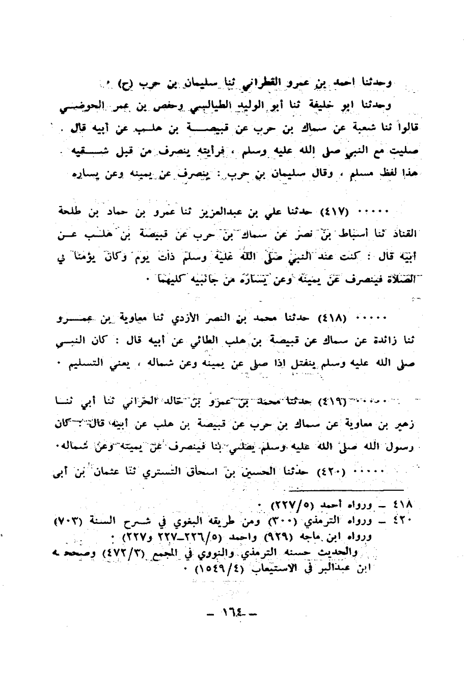 417 - حَدَّثَنَا عَلِيُّ بْنُ عَبْدِ الْعَزِيزِ، ثنا عَمْرُو بْنُ حَمَّادِ بْنِ طَلْحَةَ الْقَنَّادُ، ثنا أَسْبَاطُ بْنُ النَّصْرِ، عَنْ سِمَاكِ بْنِ حَرْبٍ، عَنْ قَبِيصَةَ بْنِ هُلْبٍ، عَنْ أَبِيهِ قَالَ: «كُنْتُ عِنْدَ النَّبِيِّ صَلَّى اللهُ عَلَيْهِ وَسَلَّمَ ذَاتَ يَوْمٍ، وَكَانَ §يَؤُمُّنَا فِي الصَّلَاةِ فَيَنْصَرِفُ عَنْ يَمِينِهِ، وَعَنْ يَسَارِهِ مِنْ جَانِبَيْهِ كِلَيْهِمَا»