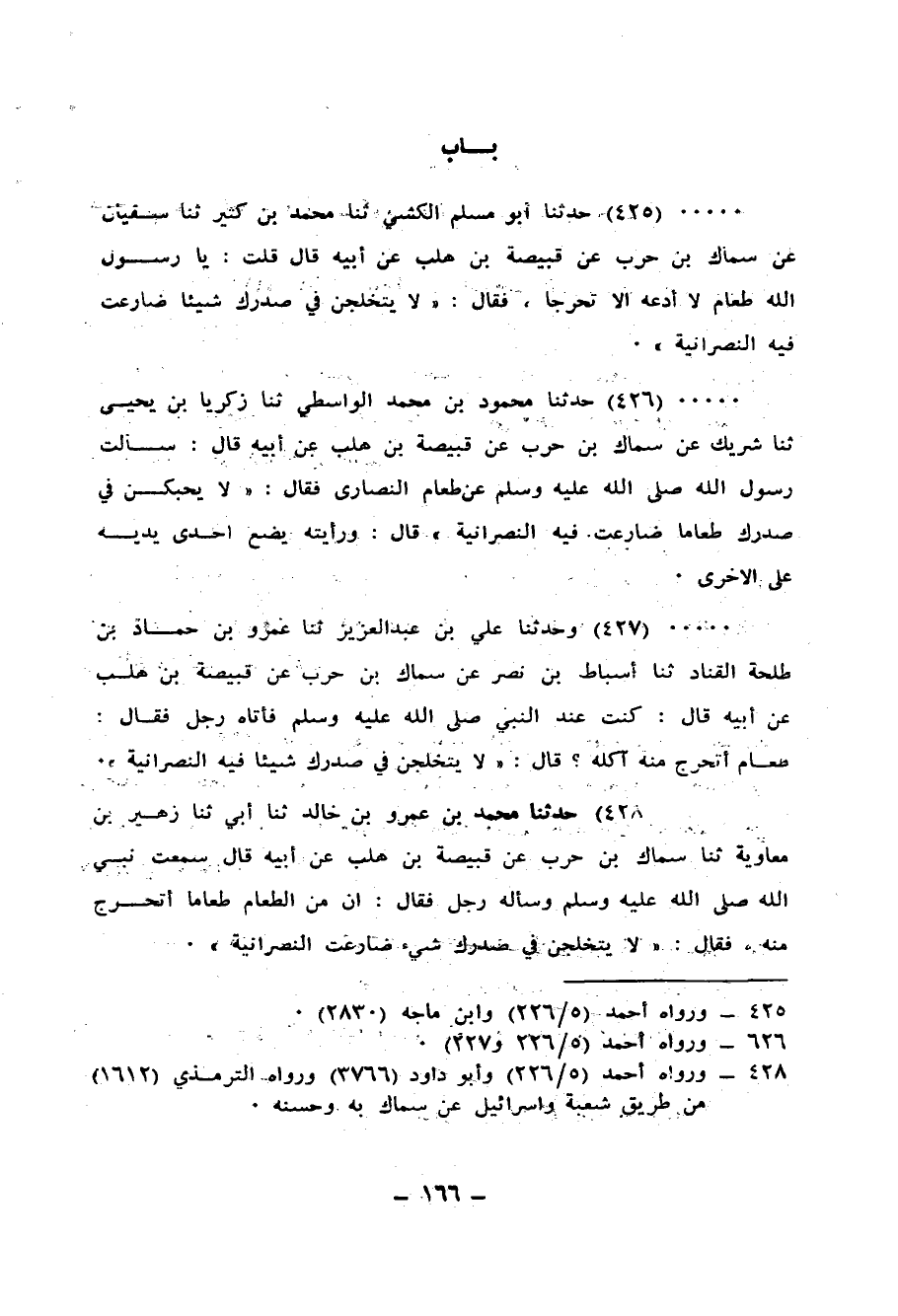 426 - حَدَّثَنَا مَحْمُودُ بْنُ مُحَمَّدٍ الْوَاسِطِيُّ، ثنا زَكَرِيَّا بْنُ يَحْيَى، ثنا شَرِيكٌ، عَنْ سِمَاكِ بْنِ حَرْبٍ، عَنْ قَبِيصَةَ بْنِ هُلْبٍ، عَنْ أَبِيهِ: قَالَ سَأَلْتُ رَسُولَ اللهِ صَلَّى اللهُ عَلَيْهِ وَسَلَّمَ، عَنْ طَعَامِ النَّصَارَى فَقَالَ: «§لَا يَحِيكَنَّ فِي صَدْرِكَ طَعَامٌ ضَارَعْتَ فِيهِ النَّصْرَانِيَّةَ» قَالَ: وَرَأَيْتُهُ يَضَعُ إِحْدَى يَدَيْهِ عَلَى الْأُخْرَى