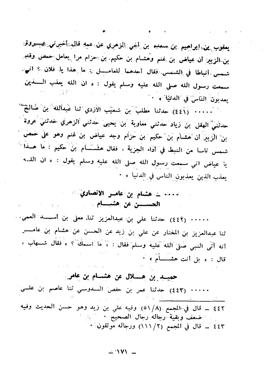 441 - حَدَّثَنَا مُطَّلِبُ بْنُ شُعَيْبٍ الْأَزْدِيُّ، ثنا عَبْدُ اللهِ بْنُ صَالِحٍ، حَدَّثَنِي الْهِقْلُ بْنُ زِيَادٍ، حَدَّثَنِي مُعَاوِيَةُ بْنُ يَحْيَى، حَدَّثَنِي الزُّهْرِيُّ، حَدَّثَنِي عُرْوَةُ بْنُ الزُّبَيْرِ: أَنَّ هِشَامَ بْنَ حَكِيمِ بْنِ حِزَامٍ، وَجَدَ عِيَاضَ بْنَ غَنْمٍ وَهُوَ عَلَى حِمْصَ شَمَّسَ نَاسًا مِنَ النَّبَطِ فِي أَدَاءِ الْجِزْيَةِ فَقَالَ هِشَامُ بْنُ حَكِيمٍ: مَا هَذَا يَا عِيَاضُ؟ إِنِّي سَمِعْتُ رَسُولَ اللهِ صَلَّى اللهُ عَلَيْهِ وَسَلَّمَ يَقُولُ: «إِنَّ §اللهَ يُعَذَّبُ الَّذِينَ يُعَذَّبُونَ النَّاسَ فِي الدُّنْيَا»