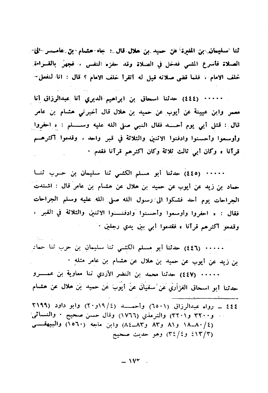 445 - حَدَّثَنَا أَبُو مُسْلِمٍ الْكَشِّيُّ، ثنا سُلَيْمَانُ بْنُ حَرْبٍ، ثنا حَمَّادُ بْنُ زَيْدٍ، عَنْ أَيُّوبَ، عَنْ حُمَيْدِ بْنِ هِلَالٍ، عَنْ هِشَامِ بْنِ عَامِرٍ قَالَ اشْتَدَّتِ الْجِرَاحَاتُ يَوْمَ أُحُدٍ فَشَكَوْا إِلَى رَسُولِ اللهِ صَلَّى اللهُ عَلَيْهِ وَسَلَّمَ الْجِرَاحَاتِ، فَقَالَ: «§احْفِرُوا وَأَوْسِعُوا وَأَحْسِنُوا وَادْفِنُوا الِاثْنَيْنِ وَالثَّلَاثَةَ فِي الْقَبْرِ وَقَدِّمُوا أَكْثَرَهُمْ قُرْآنًا» فَقَدَّمُوا أَبِي بَيْنَ يَدَيْ رَجُلَيْنِ