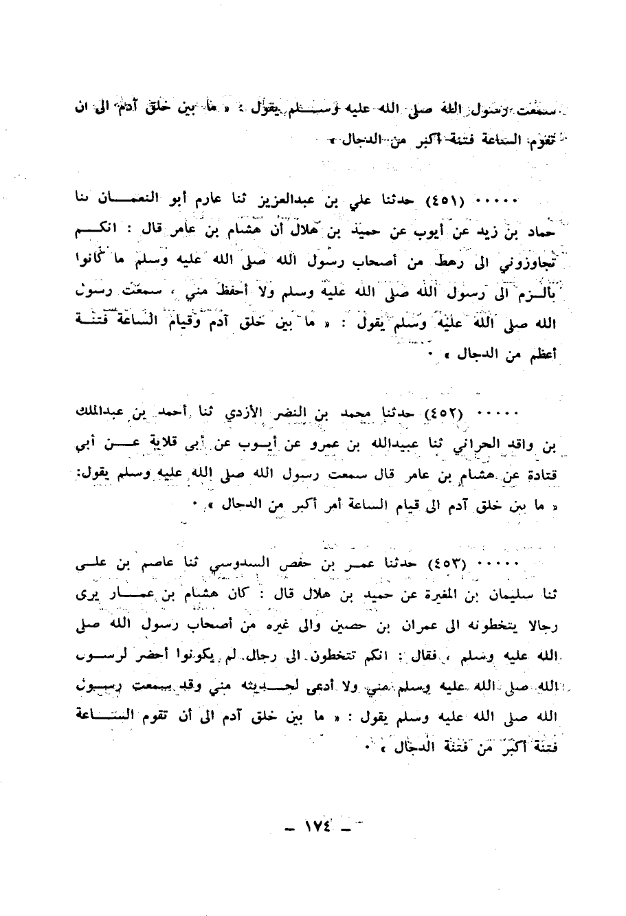 453 - حَدَّثَنَا عُمَرُ بْنُ حَفْصٍ السَّدُوسِيُّ، ثنا عَاصِمُ بْنُ عَلِيٍّ، ثنا سُلَيْمَانُ بْنُ الْمُغِيرَةِ، عَنْ حُمَيْدِ بْنِ هِلَالٍ، قَالَ: كَانَ هِشَامُ بْنُ عَامِرٍ يَرَى رِجَالًا يَتَخَطُّونَهُ إِلَى عِمْرَانَ بْنِ حُصَيْنٍ وَإِلَى غَيْرِهِ مِنْ أَصْحَابِ رَسُولِ اللهِ صَلَّى اللهُ عَلَيْهِ وَسَلَّمَ فَقَالَ: إِنَّكُمْ تَتَخَطُّونَ إِلَى رِجَالٍ لَمْ يَكُونُوا أَحْضَرَ لِرَسُولِ اللهِ صَلَّى اللهُ عَلَيْهِ وَسَلَّمَ مِنِّي وَلَا أَدْعَى لِحَدِيثِهِ مِنِّي، وَقَدْ سَمِعْتُ رَسُولَ اللهِ صَلَّى اللهُ عَلَيْهِ وَسَلَّمَ، يَقُولُ: «§مَا بَيْنَ خَلْقِ آدَمَ إِلَى أَنَّ تَقُومَ السَّاعَةُ فِتْنَةٌ أَكْبَرُ مِنْ فِتْنَةِ الدَّجَّالِ»