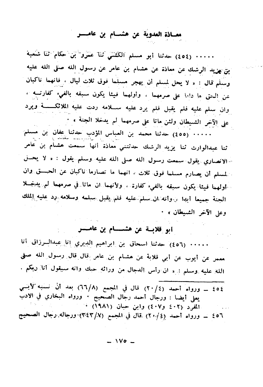 455 - حَدَّثَنَا مُحَمَّدُ بْنُ الْعَبَّاسِ الْمُؤَدِّبُ، حَدَّثَنَا عَفَّانُ بْنُ مُسْلِمٍ، ثنا عَبْدُ الْوَارِثِ، ثنا يَزِيدُ الرِّشْكُ، حَدَّثَتْنِي مُعَاذَةُ، أَنَّهَا سَمِعَتْ هِشَامَ بْنَ عَامِرٍ الْأَنْصَارِيَّ، يَقُولُ: سَمِعْتُ رَسُولَ اللهِ صَلَّى اللهُ عَلَيْهِ وَسَلَّمَ، يَقُولُ: «§لَا يَحِلُّ لِمُسْلِمٍ أَنْ يُصَارِمَ مُسْلِمًا فَوْقَ ثَلَاثٍ أَنَّهُمَا مَا تَصَارَمَا نَاكِبَانِ عَنِ الْحَقِّ، وَإِنَّ أَوَّلَهُمَا فَيْئًا يَكُونُ سَبْقُهُ بِالْفَيْءِ كَفَّارَتَهُ؛ وَلِأَنَّهُمَا إِنْ مَاتَا فِي صَرْمِهِمَا لَمْ يَدْخُلَا الْجَنَّةَ جَمِيعًا أَبَدًا، وَإِنَّهُ إِنْ سَلَّمَ عَلَيْهِ فَلَمْ يَقْبَلْ سَلَمَهُ وَسَلَامَهُ رَدَّ عَلَيْهِ الْمَلَكُ وَعَلَى الْآخَرِ الشَّيْطَانُ»