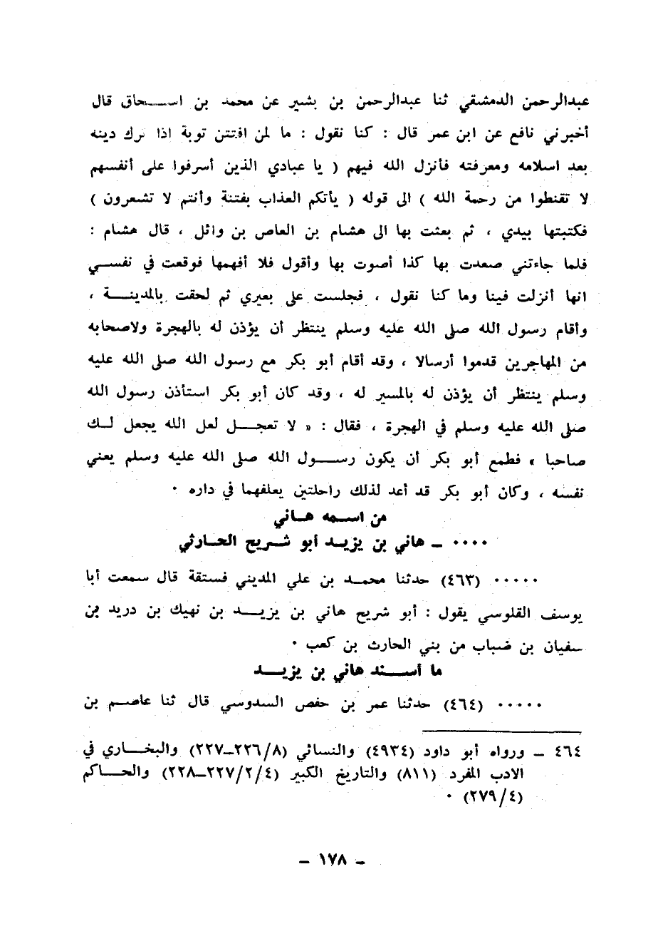 464 - حَدَّثَنَا عُمَرُ بْنُ حَفْصٍ السَّدُوسِيُّ قَالَ: ثنا عَاصِمُ بْنُ عَلِيٍّ، ثنا قَيْسُ بْنُ الرَّبِيعِ، عَنِ الْمِقْدَامِ بْنِ شُرَيْحٍ، عَنْ أَبِيهِ شُرَيْحٍ، عَنْ جَدِّهِ هَانِئِ بْنِ يَزِيدَ أَنَّهُ وَفَدَ إِلَى رَسُولِ اللهِ صَلَّى اللهُ عَلَيْهِ وَسَلَّمَ فِي نَاسٍ مِنْ قَوْمِهِ فَسَمِعَهُ رَسُولُ اللهِ صَلَّى اللهُ عَلَيْهِ وَسَلَّمَ يُكَنَّى أَبَا الْحَكَمٍ، فَقَالَ: «§لِمَ يُكَنِّيكَ هَؤُلَاءِ أَبَا الْحَكَمِ؟» قَالَ: يَا رَسُولَ اللهِ، إِنِّي كُنْتُ أَحْكُمُ بَيْنَ قَوْمِي فِي الشَّيْءِ يَكُونُ بَيْنَهُمْ فَيَرْضَى هَؤُلَاءِ وهَؤُلَاءِ، فَكُنِّيتُ أَبَا الْحَكَمِ وَلَيْسَ لِي وَلَدٌ، فَأَنَا أَبُو الْحَكَمِ. قَالَ: «هَلْ لَكَ وَلَدٌ؟» قَالَ: نَعَمْ قَالَ: «مَا اسْمُ أَكْبَرِهِمْ؟» قَالَ: شُرَيْحٌ. قَالَ: «فَأَنْتَ أَبُو شُرَيْحٍ»