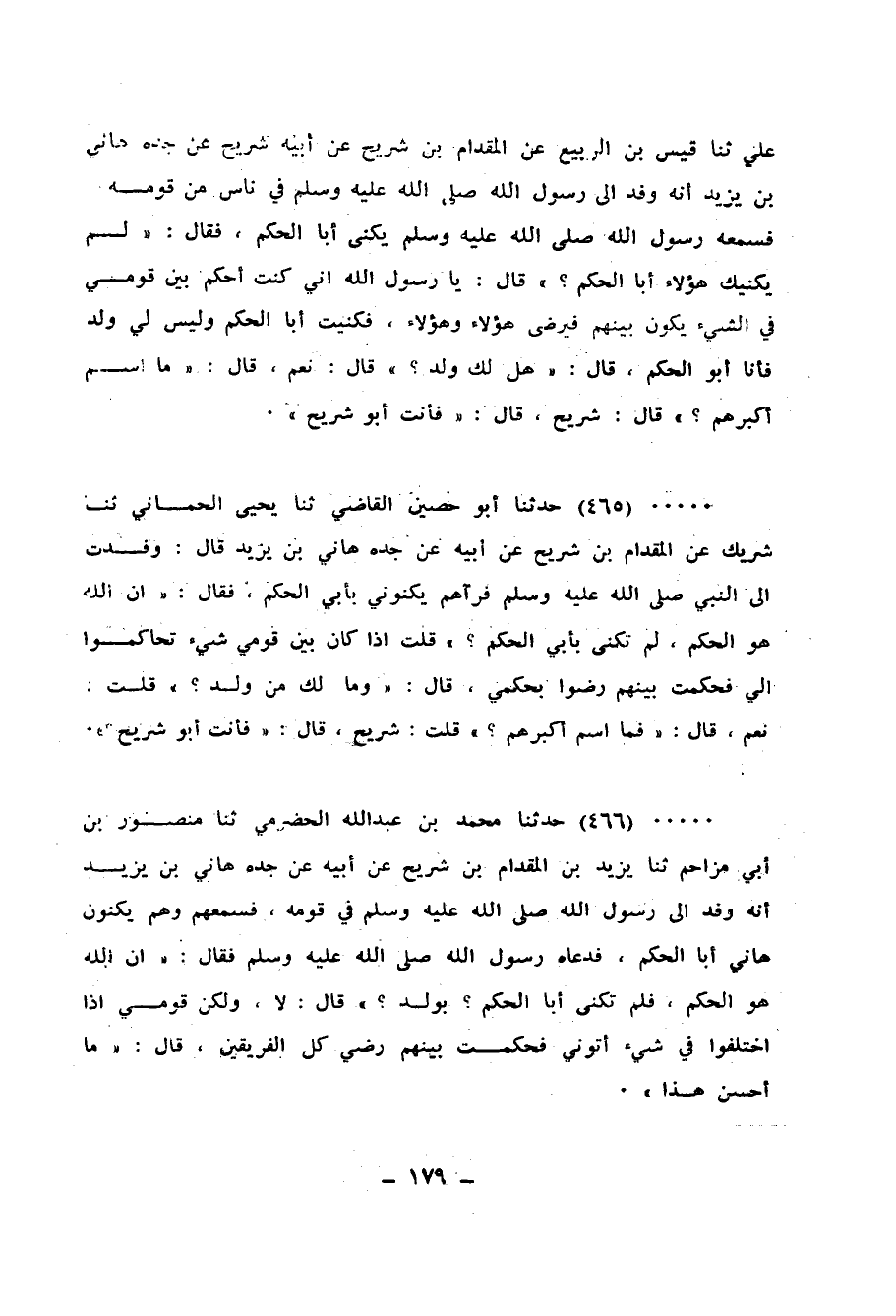 465 - حَدَّثَنَا أَبُو حَصِينٍ الْقَاضِي، ثنا يَحْيَى الْحِمَّانِيُّ، ثنا شَرِيكٌ، عَنِ الْمِقْدَامِ بْنِ شُرَيْحٍ، عَنْ أَبِيهِ، عَنْ جَدِّهِ هَانِئِ بْنِ يَزِيدَ قَالَ: وَفَدْتُ إِلَى النَّبِيِّ صَلَّى اللهُ عَلَيْهِ وَسَلَّمَ فَرَآهُمْ يُكَنُّونِي بِأَبِي الْحَكَمِ، فَقَالَ: «إِنَّ §اللهَ هُوَ الْحَكَمُ، لِمَ تُكَنَّى بِأَبِي الْحَكَمِ؟» ، قُلْتُ: إِذَا كَانَ بَيْنَ قَوْمِي شَيْءٌ تَحَاكَمُوا إِلَيَّ فَحَكَمْتُ بَيْنَهُمْ رَضُوا بِحُكْمِي. قَالَ: «وَمَا لَكَ مِنْ وَلَدٍ؟» ، قُلْتُ: نَعَمْ. قَالَ: «فَمَا اسْمُ أَكْبَرِهِمْ؟» ، قُلْتُ: شُرَيْحٌ. قَالَ: «فَأَنْتَ أَبُو شُرَيْحٍ»