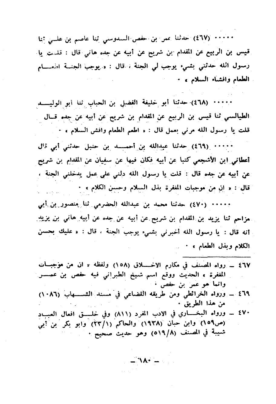 469 - حَدَّثَنَا عَبْدُ اللهِ بْنُ أَحْمَدَ بْنِ حَنْبَلٍ، حَدَّثَنِي أَبِي، قَالَ: أَعْطَانِي ابْنُ الْأَشْجَعِيُّ كُتُبَا عَنْ أَبِيهِ، فَكَانَ فِيهَا عَنْ سُفْيَانَ، عَنِ الْمِقْدَامِ بْنِ شُرَيْحٍ، عَنْ أَبِيهِ، عَنْ جَدِّهِ قَالَ: قُلْتُ: يَا رَسُولَ اللهِ، دُلَّنِي عَلَى عَمِلٍ يُدْخِلُنِي الْجَنَّةَ قَالَ: «إِنَّ §مِنْ مُوجِبَاتِ الْمَغْفِرَةِ بَذْلُ السَّلَامِ، وَحُسْنُ الْكَلَامِ»