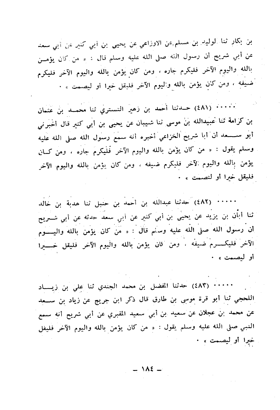 481 - حَدَّثَنَا أَحْمَدُ بْنُ زُهَيْرٍ التُّسْتَرِيُّ، ثنا مُحَمَّدُ بْنُ عُثْمَانَ بْنِ كَرَامَةَ، ثنا عُبَيْدُ اللهِ بْنُ مُوسَى، ثنا شَيْبَانُ، عَنْ يَحْيَى بْنِ أَبِي كَثِيرٍ، قَالَ: أَخْبَرَنِي أَبُو سَعْدٍ: أَنَّ أَبَا شُرَيْحٍ الْخُزَاعِيَّ أَخْبَرَهُ أَنَّهُ سَمِعَ رَسُولَ اللهِ صَلَّى اللهُ عَلَيْهِ وَسَلَّمَ، يَقُولُ: «§مَنْ كَانَ يُؤْمِنُ بِاللهِ وَالْيَوْمِ الْآخِرِ فَلْيُكْرِمْ جَارَهُ، وَمَنْ كَانَ يُؤْمِنُ بِاللهِ وَالْيَوْمِ الْآخِرِ فَلْيُكْرِمْ ضَيْفَهُ، وَمَنْ كَانَ يُؤْمِنُ بِاللهِ وَالْيَوْمِ الْآخِرِ فَلْيَقُلْ خَيْرًا أَوْ لِيَصْمُتْ»