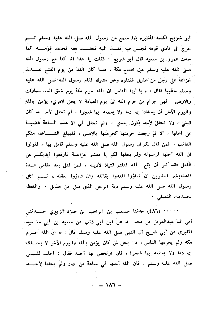 486 - حَدَّثَنَا مُصْعَبُ بْنُ إِبْرَاهِيمَ بْنِ حَمْزَةَ الزُّبَيْرِيُّ، حَدَّثَنِي أَبِي، ثنا عَبْدُ الْعَزِيزِ بْنُ مُحَمَّدٍ، عَنِ ابْنِ أَبِي ذِئْبٍ، عَنْ سَعِيدِ بْنِ أَبِي سَعِيدٍ الْمَقْبُرِيِّ، عَنْ أَبِي شُرَيْحٍ، أَنَّ النَّبِيَّ صَلَّى اللهُ عَلَيْهِ وَسَلَّمَ قَالَ: " إِنَّ §اللهَ حَرَّمَ مَكَّةَ وَلَمْ يُحَرِّمْهَا النَّاسُ، فَلَا يَحِلُّ لِمَنْ كَانَ يُؤْمِنُ بِاللهِ وَالْيَوْمِ الْآخِرِ لَا يَسْفِكُ بِهَا دَمًا وَلَا يَعْضِدُ بِهَا شَجَرَةً، فَإِنِ ارْتَخَصَ بِهَا أَحَدٌ، فَقَالَ: أُحِلَّتْ لِلنَّبِيِّ صَلَّى اللهُ عَلَيْهِ وَسَلَّمَ، فَإِنَّ اللهَ أَحَلَّهَا لِي سَاعَةً مِنْ نَهَارٍ وَلَمْ يُحِلِّهَا لِأَحَدٍ غَيْرِي، ثُمَّ هِيَ حَرَامٌ كَحُرْمَتِهَا بِالْأَمْسِ، يَا خُزَاعَةُ: إِنَّكُمْ قَتَلْتُمْ هَذَا الْقَتِيلَ مِنْ هُذَيْلٍ وَأَنَا وَاللهِ عَاقِلُهُ فَمَنْ قَتَلَ بِهَا قَتِيلًا بَعْدَ هَذَا فَأَهْلُهُ بَيْنَ خِيَرَتَيْنِ: إِنْ أَحَبُّوا قَتَلُوا، وَإِنْ أَحَبُّوا أَخَذُوا الدِّيَةَ "