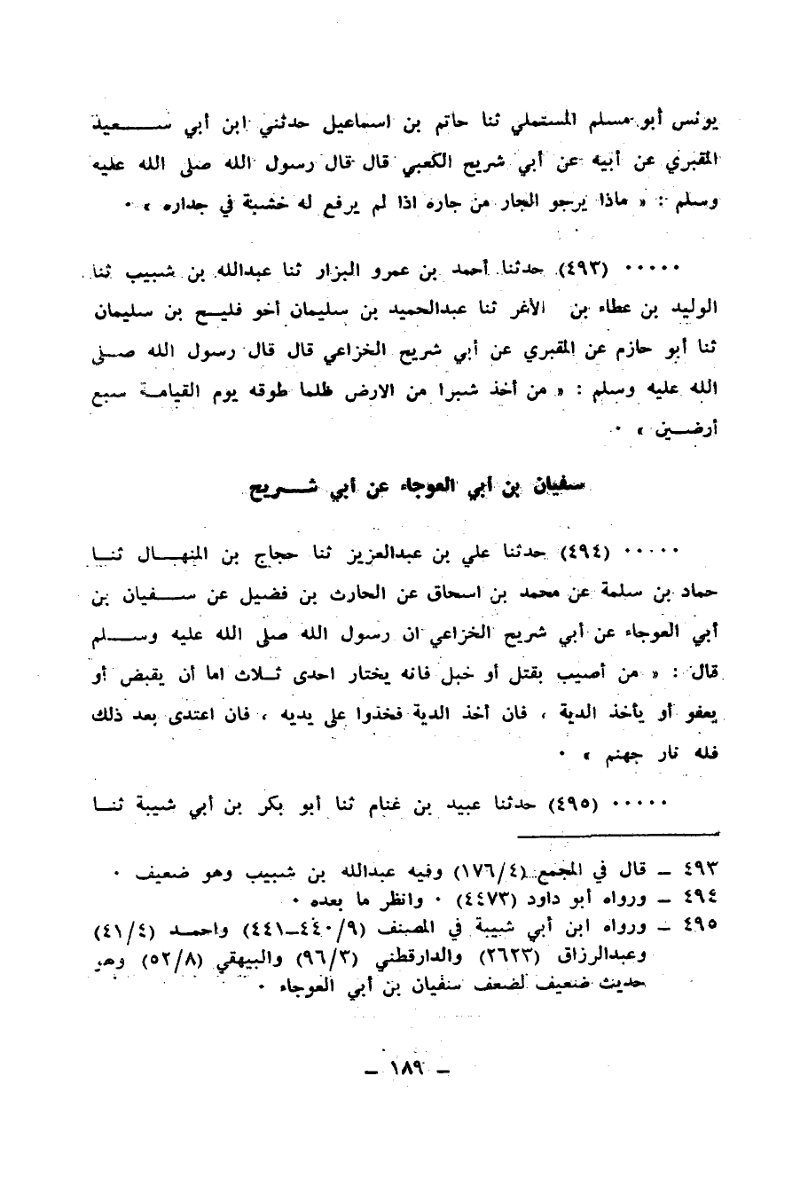 494 - حَدَّثَنَا عَلِيُّ بْنُ عَبْدِ الْعَزِيزِ، ثنا حَجَّاجُ بْنُ الْمِنْهَالِ، ثنا حَمَّادُ بْنُ سَلَمَةَ، عَنْ مُحَمَّدِ بْنِ إِسْحَاقَ، عَنِ الْحَارِثِ بْنِ فُضَيْلِ، عَنْ سُفْيَانَ بْنِ أَبِي الْعَوْجَاءِ، عَنْ أَبِي شُرَيْحٍ الْخُزَاعِيِّ: أَنَّ رَسُولَ اللهِ صَلَّى اللهُ عَلَيْهِ وَسَلَّمَ قَالَ: " §مَنْ أُصِيبَ بِقَتْلٍ أَوْ خَبْلٍ فَإِنَّهُ يَخْتَارُ إِحْدَى ثَلَاثٍ: إِمَّا أَنْ يَقْبِضَ، أَوْ يَعْفُوَ، أَوْ يَأْخُذَ الدِّيَةَ: فَإِنْ أَخَذَ الدِّيَةَ فَخُذُوا عَلَى يَدَيْهِ، فَإِنِ اعْتَدَى بَعْدَ ذَلِكَ فَلَهُ نَارُ جَهَنَّمَ "