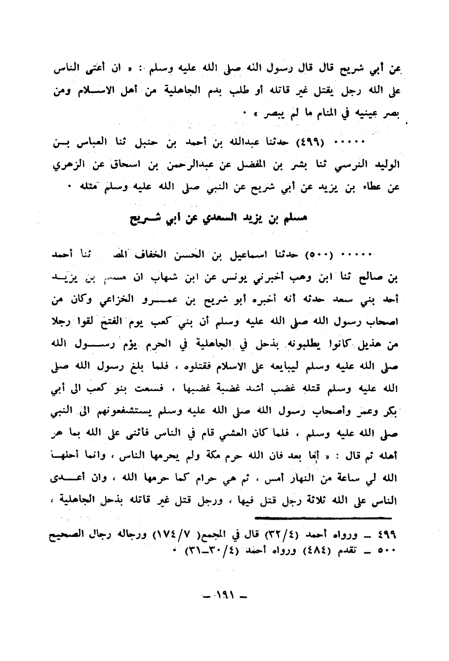 500 - حَدَّثَنَا إِسْمَاعِيلُ بْنُ الْحَسَنِ الْخَفَّافُ الْمِصْرِيُّ، ثنا أَحْمَدُ بْنُ صَالِحٍ، ثنا ابْنُ وَهْبٍ، أَخْبَرَنِي يُونُسُ، عَنِ ابْنِ شِهَابٍ، أَنَّ مُسْلِمَ بْنَ يَزِيدَ، أَحَدَ بَنِي سَعْدٍ، حَدَّثَهُ أَنَّهُ، أَخْبَرَهُ أَبُو شُرَيْحِ بْنِ عَمْرٍو الْخُزَاعِيِّ، وَكَانَ، مِنْ أَصْحَابِ رَسُولِ اللهِ صَلَّى اللهُ عَلَيْهِ وَسَلَّمَ أَنَّ بَنِي كَعْبٍ يَوْمَ الْفَتْحِ لَقُوا رَجُلًا مِنْ هُذَيْلٍ كَانُوا يَطْلُبُونَهُ بِذَحْلٍ فِي الْجَاهِلِيَّةِ فِي الْحَرَمِ يَؤُمُّ رَسُولَ اللهِ صَلَّى اللهُ عَلَيْهِ وَسَلَّمَ لِيُبَايِعَهُ عَلَى الْإِسْلَامِ فَقَتَلُوهُ، فَلَمَّا بَلَغَ رَسُولَ اللهِ صَلَّى اللهُ عَلَيْهِ وَسَلَّمَ قَتْلُهُ غَضِبَ أَشَدَّ غَضْبَةٍ غَضِبَهَا فَسَعَتْ بَنُو كَعْبٍ إِلَى أَبِي بَكْرٍ وَعُمَرَ وَأَصْحَابِ رَسُولِ اللهِ صَلَّى اللهُ عَلَيْهِ وَسَلَّمَ يَسْتَشْفِعُونَهُمْ إِلَى النَّبِيِّ صَلَّى اللهُ عَلَيْهِ وَسَلَّمَ فَلَمَّا كَانَ الْعَشِيُّ قَامَ فِي النَّاسِ، فَأَثْنَى عَلَى اللهِ بِمَا هُوَ أَهْلُهُ ثُمَّ قَالَ: " أَمَا بَعْدُ، فَإِنَّ §اللهَ حَرَّمَ مَكَّةَ وَلَمْ يُحَرِّمْهَا النَّاسُ، وَإِنَّمَا أَحَلَّهَا اللهُ لِي سَاعَةً مِنَ النَّهَارِ أَمْسِ، ثُمَّ هِيَ حَرَامٌ كَمَا حَرَّمَهَا اللهُ، وَإِنَّ أَعْدَى النَّاسِ عَلَى اللهِ ثَلَاثَةٌ: رَجُلٌ قَتَلَ فِيهَا وَرَجُلٌ قَتَلَ غَيْرَ قَاتَلِهِ بِذَحْلِ الْجَاهِلِيَّةِ، وَإِنِّي وَاللهِ لَأَدِيَنَّ هَذَا الرَّجُلَ الَّذِي أَصَبْتُمْ " قَالَ أَبُو شُرَيْحٍ: فَوَدَاهُ رَسُولُ اللهِ صَلَّى اللهُ عَلَيْهِ وَسَلَّمَ