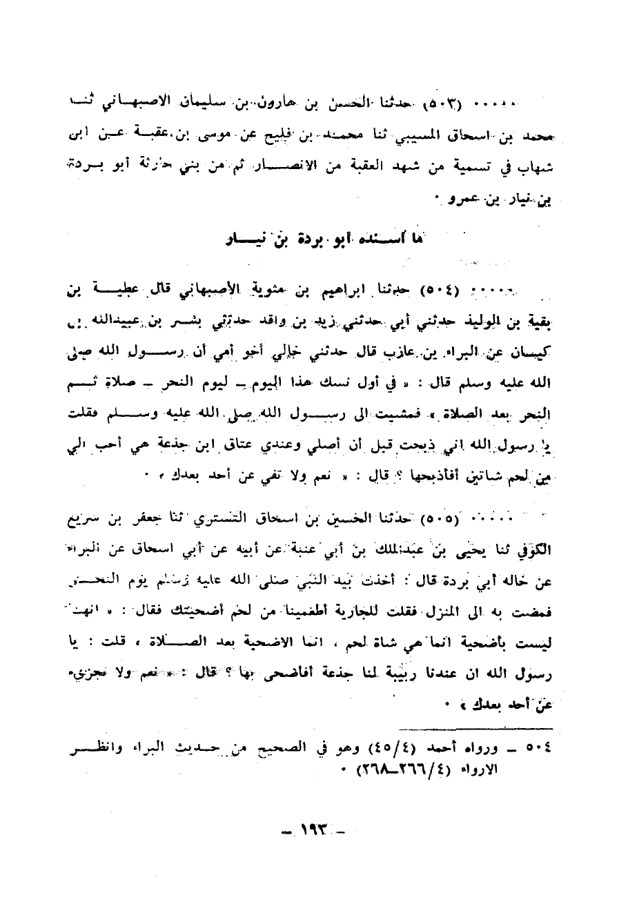 504 - حَدَّثَنَا إِبْرَاهِيمُ بْنُ مَثْوَيَةَ الْأَصْبَهَانِيُّ، قَالَ عَطِيَّةُ بْنُ بَقِيَّةَ بْنِ الْوَلِيدِ: حَدَّثَنِي أَبِي، حَدَّثَنِي زَيْدُ بْنُ وَاقِدٍ، حَدَّثَنِي بِشْرُ بْنُ عُبَيْدِ اللهِ بْنِ كَيْسَانَ، عَنِ الْبَرَاءِ بْنِ عَازِبٍ، قَالَ: حَدَّثَنِي خَالِي، أَخُو أُمِّي، أَنَّ رَسُولَ اللهِ صَلَّى اللهُ عَلَيْهِ وَسَلَّمَ، قَالَ: «§فِي أَوَّلِ نُسُكِ هَذَا الْيَوْمِ - لِيَوْمِ النَّحْرِ - صَلَاةٌ، ثُمَّ النَّحْرُ بَعْدَ الصَّلَاةِ» فَمَشَيْتُ إِلَى رَسُولِ اللهِ صَلَّى اللهُ عَلَيْهِ وَسَلَّمَ، فَقُلْتُ: يَا رَسُولَ اللهِ، إِنِّي ذَبَحْتُ قَبْلَ أَنْ أُصَلِّيَ وَعِنْدِي عَتَاقٌ ابْنُ جَذَعَةَ هِيَ أَحَبُّ إِلَيَّ مِنْ لَحْمِ شَاتَيْنِ أَفَأَذْبَحُهَا؟ قَالَ: «نَعَمْ، وَلَا تَفِي عَنْ أَحَدٍ بَعْدَكَ»