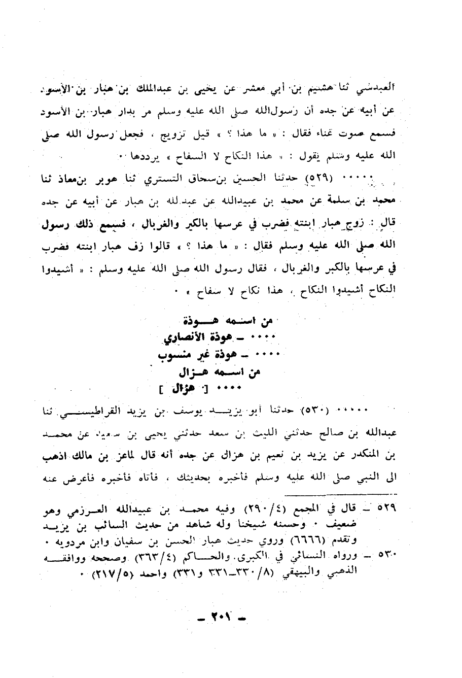 529 - حَدَّثَنَا الْحُسَيْنُ بْنُ إِسْحَاقَ التُّسْتَرِيُّ، ثنا هَوْبَرُ بْنُ مُعَاذٍ، ثنا مُحَمَّدُ بْنُ سَلَمَةَ، عَنْ مُحَمَّدِ بْنِ عُبَيْدِ اللهِ، عَنْ عَبْدِ اللهِ بْنِ هَبَّارٍ، عَنْ أَبِيهِ، عَنْ جَدِّهِ، قَالَ: زَوَّجَ هَبَّارٌ ابْنَتَهُ فَضَرَبَ فِي عُرْسِهَا بِالْكِيرِ وَالْغِرْبَالِ فَسَمِعَ ذَلِكَ، رَسُولُ اللهِ صَلَّى اللهُ عَلَيْهِ وَسَلَّمَ فَقَالَ: «مَا هَذَا؟» قَالُوا: زَفَّ هَبَّارُ ابْنَتَهُ فَضَرَبَ فِي عُرْسِهَا بِالْكِيرِ وَالْغِرْبَالِ فَقَالَ رَسُولُ اللهِ صَلَّى اللهُ عَلَيْهِ وَسَلَّمَ: «§أشيدوا النِّكَاحَ أشيدوا النِّكَاحَ، هَذَا نِكَاحٌ لَا سفاحٌ»