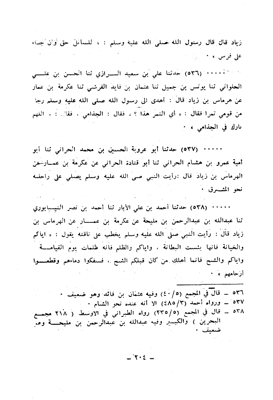 537 - حَدَّثَنَا أَبُو عَرُوبَةَ الْحُسَيْنُ بْنُ مُحَمَّدُ الْحَرَّانِيُّ، ثنا أَبُو أُمَيَّةَ عَمْرُو بْنُ هِشَامٍ الْحَرَّانِيُّ، ثنا أَبُو قَتَادَةَ الْحَرَّانِيُّ، عَنْ عِكْرِمَةَ بْنِ عَمَّارٍ، عَنِ الْهِرْمَاسِ بْنِ زِيَادٍ، قَالَ: «رَأَيْتُ النَّبِيَّ صَلَّى اللهُ عَلَيْهِ وَسَلَّمَ §يُصَلِّي عَلَى رَاحِلَتِهِ نَحْوَ الْمَشْرِقِ»