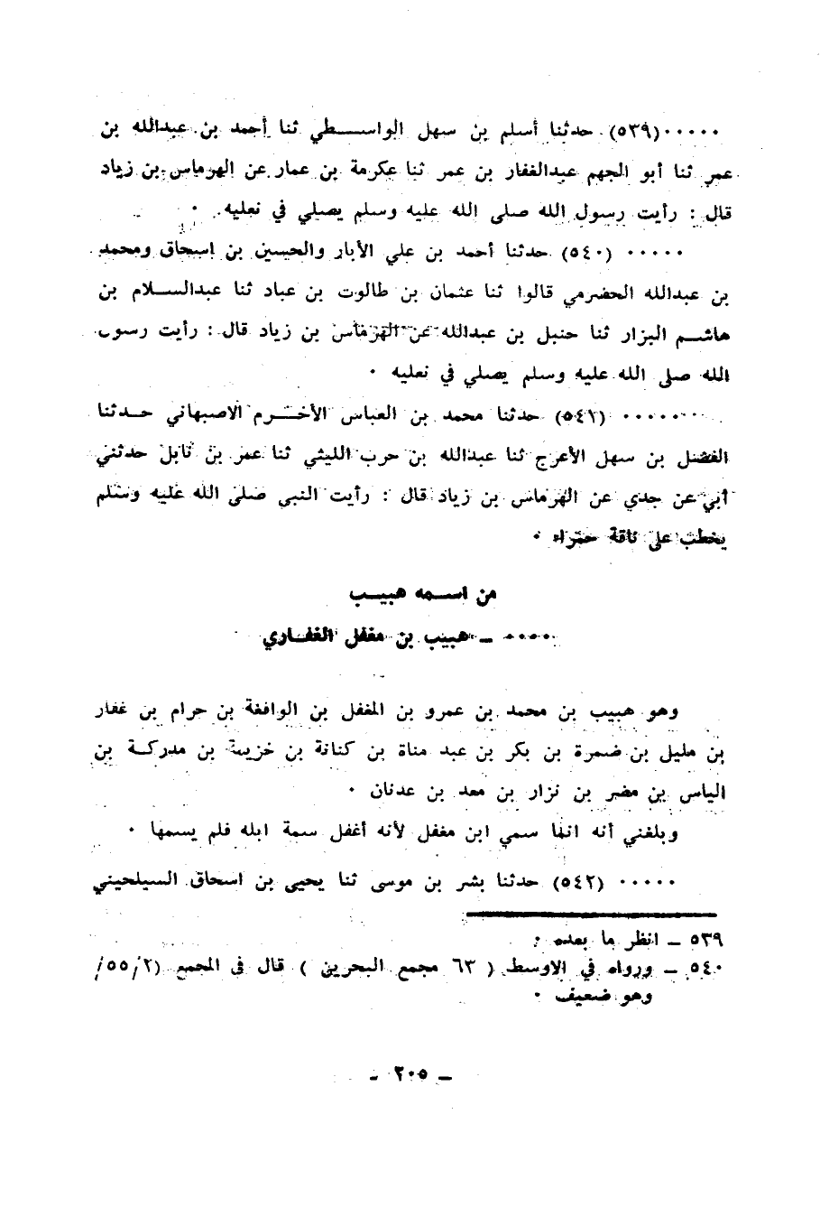 540 - حَدَّثَنَا أَحْمَدُ بْنُ عَلِيٍّ الْأَبَّارُ، وَالْحُسَيْنُ بْنُ إِسْحَاقَ، وَمُحَمَّدُ بْنُ عَبْدِ اللهِ الْحَضْرَمِيُّ، قَالُوا: ثنا عُثْمَانُ بْنُ طَالُوتَ بْنِ عَبَّادٍ، ثنا عَبْدُ السَّلَامُ بْنُ هَاشِمٍ الْبَزَّارُ، ثنا حَنْبَلُ بْنُ عَبْدِ اللهِ، عَنِ الْهِرْمَاسِ بْنِ زِيَادٍ، قَالَ: «رَأَيْتُ رَسُولَ اللهِ صَلَّى اللهُ عَلَيْهِ وَسَلَّمَ §يُصَلِّي فِي نَعْلَيْهِ»