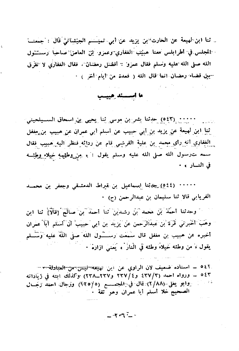 543 - حَدَّثَنَا بِشْرُ بْنُ مُوسَى، ثنا يَحْيَى بْنُ إِسْحَاقَ السَّيْلَحِينَيُّ، ثنا ابْنُ لَهِيعَةَ، عَنْ يَزِيدَ بْنِ أَبِي حَبِيبٍ، عَنْ أَسْلَمَ أَبِي عِمْرَانَ، عَنْ هُبَيْبِ بْنِ مُغَفَّلٍ الْغِفَارِيِّ، أَنَّهُ رَأَى مُحَمَّدَ ابْنَ عُلَيَّةَ الْقُرَشِيَّ قَامَ عَنْ رِدَائِهِ، فَنَظَرَ إِلَيْهِ هُبَيْبُ فَقَالَ: سَمِعْتُ رَسُولَ اللهِ صَلَّى اللهُ عَلَيْهِ وَسَلَّمَ يَقُولُ: «§مَنْ وَطِئَهُ خُيَلَاءُ، وَطِئَهُ فِي النَّارِ»