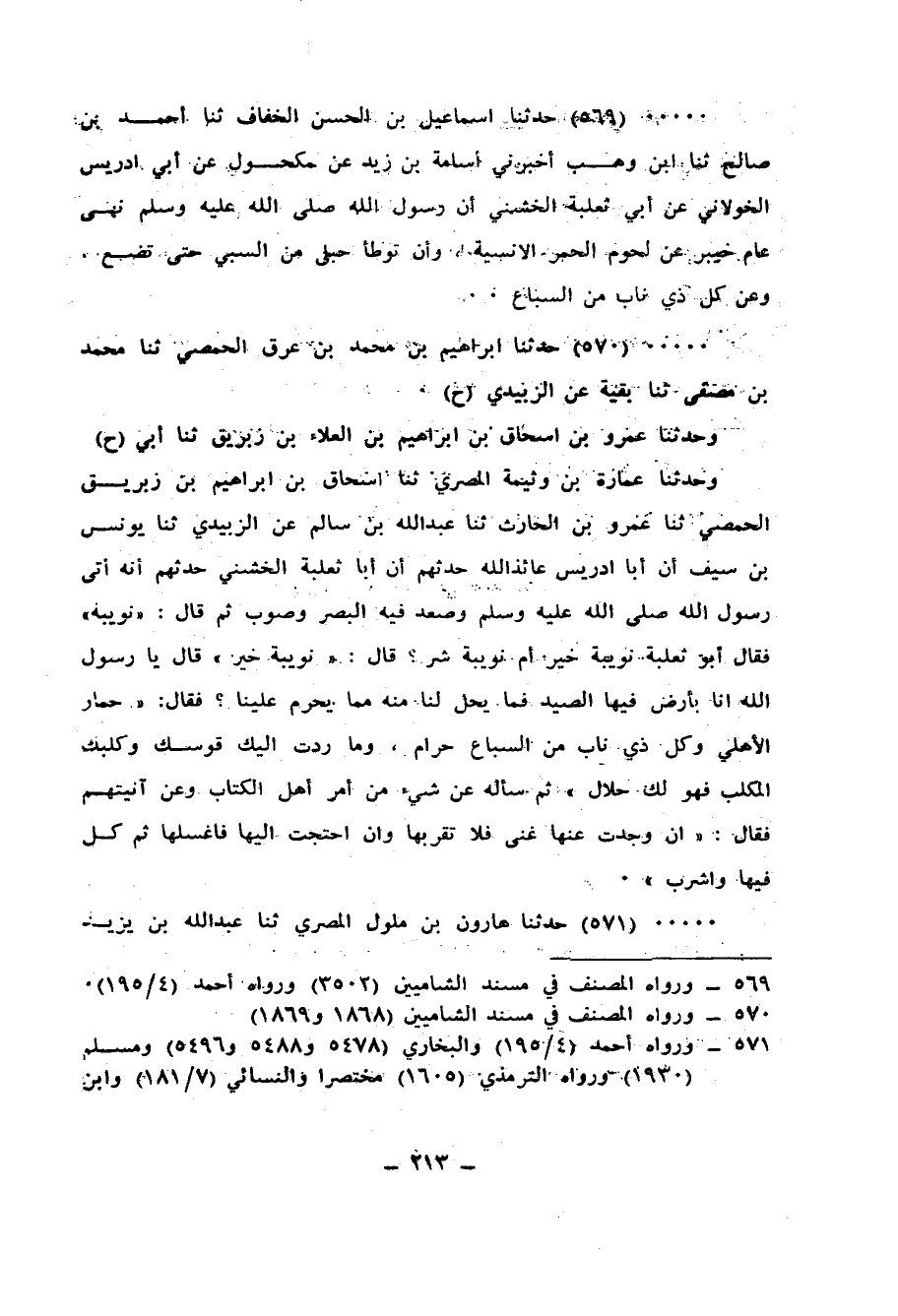 571 - حَدَّثَنَا هَارُونُ بْنُ مَلُّولٍ الْمِصْرِيُّ، ثنا عَبْدُ اللهِ بْنُ يَزِيدَ الْمُقْرِئُ، ثنا حَيْوَةُ بْنُ شُرَيْحٍ، قَالَ: سَمِعْتُ رَبِيعَةَ بْنَ يَزِيدَ الدِّمَشْقِيَّ، يَقُولُ: سَمِعْتَ أَبَا إِدْرِيسَ الْخَوْلَانِيَّ، يُحَدِّثُ أَنَّهُ، سَمِعَ أَبَا ثَعْلَبَةَ، يَقُولُ: أَتَيْتُ رَسُولَ اللهِ صَلَّى اللهُ عَلَيْهِ وَسَلَّمَ، فَقُلْتُ: يَا رَسُولَ اللهِ، إِنَّا بِأَرْضِ أَهْلِ كِتَابٍ نُؤَاكِلُهُمْ فِي آنِيَتِهِمْ، وَإِنَّ أَرْضَنَا أَرْضُ صَيْدٍ نَصِيدُ بِالْقَوْسِ وَالْكَلْبِ الْمُكَلَّبِ، وَالْكَلْبُ الَّذِي لَيْسَ بِمُكَلَّبٍ، فَأَخْبِرْنِي مَاذَا يَحِلُّ لِي مِمَّا يَحْرُمُ عَلِيَّ؟، فَقَالَ: «§أَمَا مَا ذَكَرْتَ أَنَّكُمْ بِأَرْضِ أَهْلِ الْكِتَابِ تَأْكُلُونَ فِي آنِيَتِهِمْ، فَإِنْ وَجَدْتُمْ غَيْرَ آنِيَتِهِمْ، فَلَا تَأْكُلُوا فِيهَا، وَإِنْ لَمْ تَجِدُوا غَيْرَهَا فَاغْسِلُوا وَكُلُوا فِيهَا، وَأَمَّا مَا ذَكَرْتَ مِنْ أَمْرِ الصَّيْدِ فَمَا صِدْتَ بِقَوْسِكَ وَذَكَرْتَ اسْمَ اللهِ عَلَيْهِ فَكُلْ، وَأَمَّا مَا صَادَ كَلْبُكَ الَّذِي لَيْسَ بِمُكَلَّبٍ فَمَا أَدْرَكْتَ ذَكَاتَهُ فَكُلْ، وَمَا لَمْ تُدْرِكْ ذَكَاتَهُ فَلَا تَأْكُلُ مِنْهُ، وَأَمَّا مَا صَادَ كَلْبُكَ الْمُكَلَّبُ فَكُلْ مِمَّا أَمْسَكَ عَلَيْكَ وَاذْكُرِ اسْمَ اللهِ عَلَيْهِ»