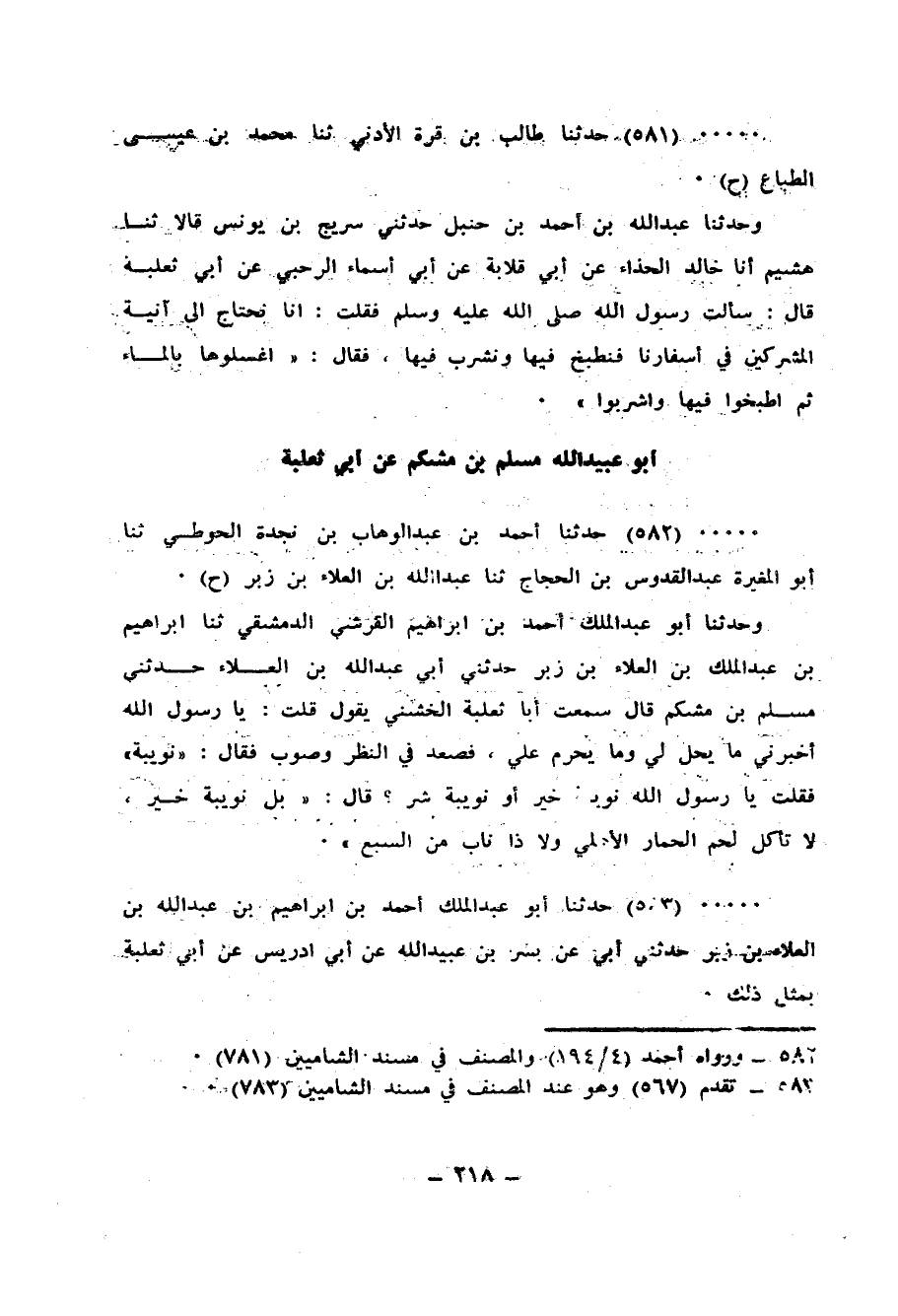 581 - حَدَّثَنَا طَالِبُ بْنُ قُرَّةَ الْأَذَنِيُّ، ثنا مُحَمَّدُ بْنُ عِيسَى الطَّبَّاعُ، ح وَحَدَّثَنَا عَبْدُ اللهِ بْنُ أَحْمَدَ بْنِ حَنْبَلٍ، حَدَّثَنِي سُرَيْجُ بْنُ يُونُسَ، قَالَا: ثنا هُشَيْمٌ، أنا خَالِدٌ الْحَذَّاءُ، عَنْ أَبِي قِلَابَةَ، عَنْ أَبِي أَسْمَاءِ الرَّحَبِيِّ، عَنْ أَبِي ثَعْلَبَةَ، قَالَ: سَأَلْتُ رَسُولَ اللهِ صَلَّى اللهُ عَلَيْهِ وَسَلَّمَ، فَقُلْتُ: إِنَّا نَحْتَاجُ إِلَى آنِيَةِ الْمُشْرِكِينَ فِي أَسْفَارِنَا فَنَطْبُخُ فِيهَا وَنَشْرَبُ فِيهَا، فَقَالَ: «§اغْسِلُوهَا بِالْمَاءِ ثُمَّ اطْبُخُوا فِيهَا وَاشْرَبُوا»