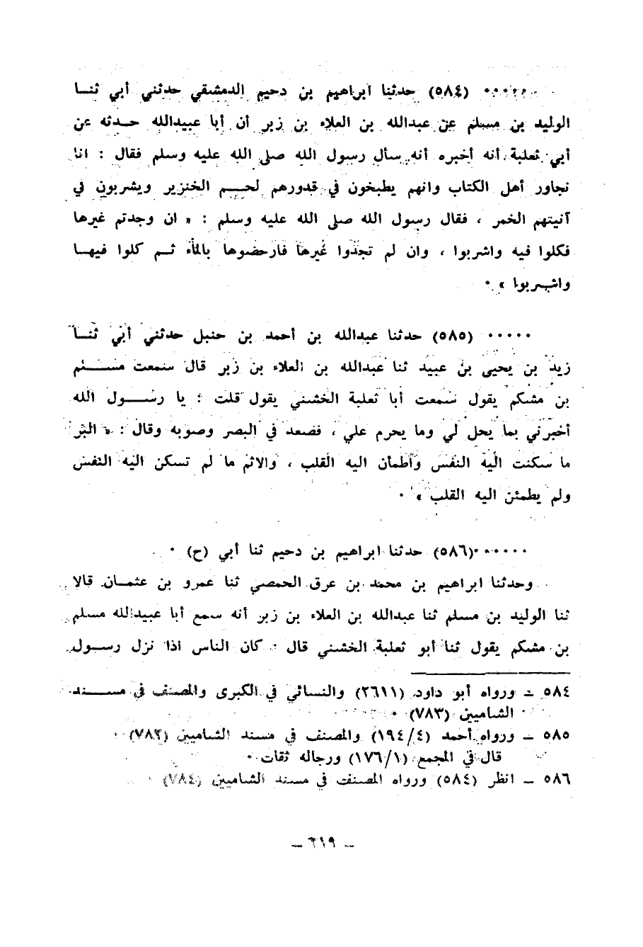 585 - حَدَّثَنَا عَبْدُ اللهِ بْنُ أَحْمَدَ بْنِ حَنْبَلٍ، حَدَّثَنِي أَبِي، ثنا زَيْدُ بْنُ يَحْيَى بْنِ عُبَيْدٍ، ثنا عَبْدُ اللهِ بْنُ الْعَلَاءِ بْنِ زَبْرٍ، قَالَ: سَمِعْتُ مُسْلِمَ بْنَ مِشْكَمٍ، يَقُولُ: سَمِعْتُ أَبَا ثَعْلَبَةَ الْخُشَنِيَّ، يَقُولُ: قُلْتُ: يَا رَسُولَ اللهِ، أَخْبِرْنِي بِمَا يَحِلُّ لِي وَمَا يَحْرُمُ عَلَيَّ فَصَعَّدَ فِيَّ الْبَصَرَ وَصَوَّبَهُ، وَقَالَ: «§الْبِرُّ مَا سَكَنَتْ إِلَيْهِ النَّفْسُ وَاطْمَأَنَّ إِلَيْهِ الْقَلْبُ وَالْإِثْمُ مَا لَمْ تَسْكُنْ إِلَيْهِ النَّفْسُ وَلَمْ يَطْمَئِنْ إِلَيْهِ الْقَلْبُ»