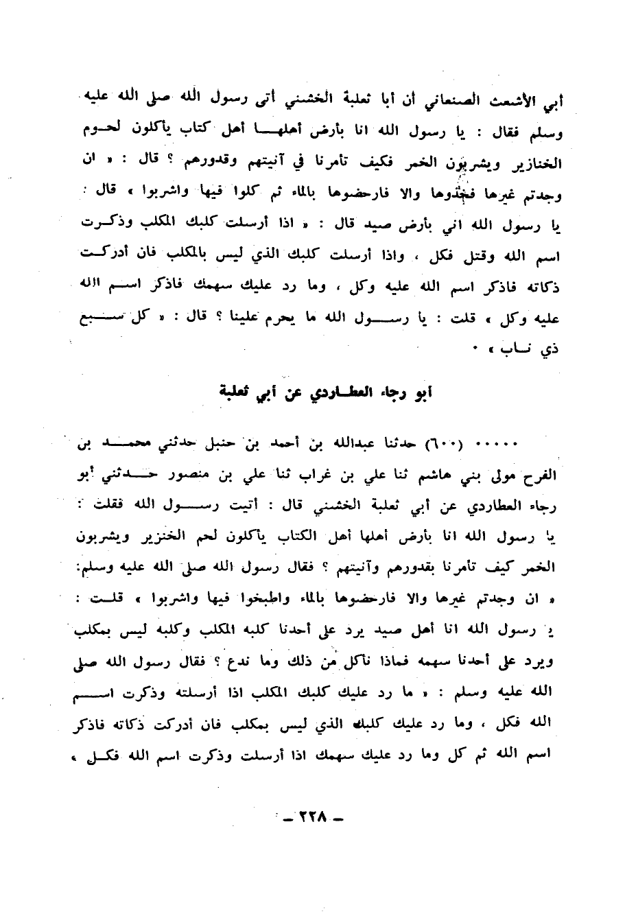 600 - حَدَّثَنَا عَبْدُ اللهِ بْنُ أَحْمَدَ بْنِ حَنْبَلٍ، حَدَّثَنِي مُحَمَّدُ بْنُ الْفَرَحِ مَوْلَى بَنِي هَاشِمٍ ثَنَا عَلِيُّ بْنُ غُرَابٍ، ثَنَا عَلِيُّ بْنُ مَنْصُورٍ، حَدَّثَنِي أَبُو رَجَاءٍ الْعُطَارِدِيُّ، عَنْ أَبِي ثَعْلَبَةَ الْخُشَنِيِّ، قَالَ: أَتَيْتُ رَسُولَ اللهِ فَقُلْتُ: يَا رَسُولَ اللهِ، إِنَّا بِأَرْضِ أَهْلُهَا أَهْلُ الْكِتَابِ يَأْكُلُونَ لَحْمَ الْخِنْزِيرِ وَيَشْرَبُونَ الْخَمْرَ كَيْفَ تَأْمُرُنَا بِقُدُورِهِمْ وآنِيَتِهِمِ؟ فَقَالَ رَسُولُ اللهِ صَلَّى اللهُ عَلَيْهِ وَسَلَّمَ إِ§نْ وَجَدْتُمْ غَيْرَهَا وَإِلَّا فَارْحَضُوهَا بِالْمَاءِ وَاطْبُخُوا فِيهَا وَاشْرَبُوا "