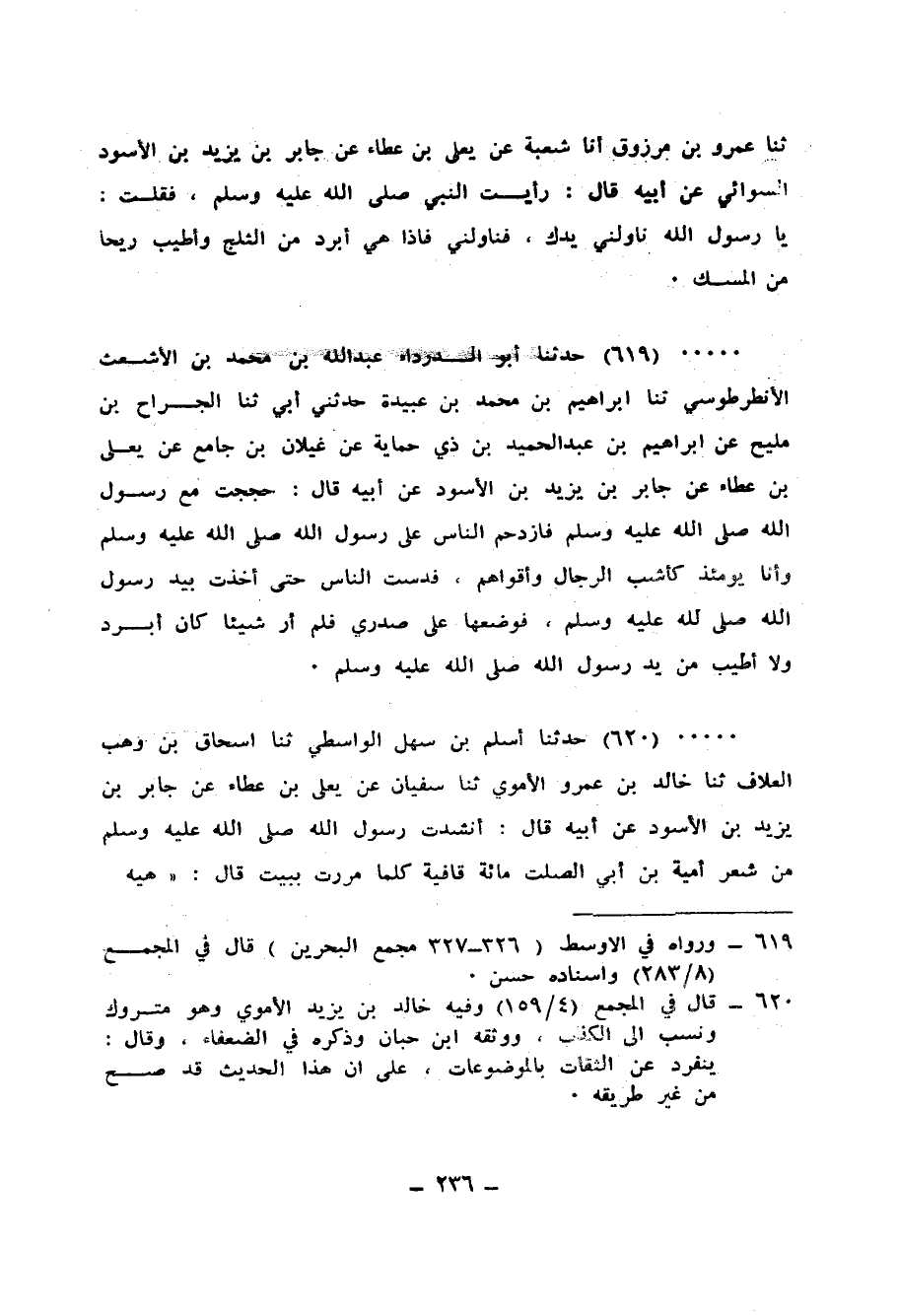 619 - حَدَّثَنَا أَبُو الدَّرْدَاءِ عَبْدُ اللهِ بْنِ مُحَمَّدِ بْنِ الْأَشْعَثِ الْأَنْطَرْطُوسِيُّ، ثَنَا إِبْرَاهِيمُ بْنُ مُحَمَّدِ بْنِ عُبَيْدَةَ، حَدَّثَنِي أَبِي، ثَنَا الْجَرَّاحُ بْنُ مَلِيحٍ، عَنْ إِبْرَاهِيمَ بْنِ عَبْدِ الْحَمِيدِ بْنِ ذِي حِمَايَةَ، عَنْ غَيْلَانَ بْنِ جَامِعٍ، عَنْ يَعْلَى بْنِ عَطَاءٍ، عَنْ جَابِرِ بْنِ يَزِيدَ بْنِ الْأَسْوَدِ، عَنْ أَبِيهِ، قَالَ: «حَجَجْتُ مَعَ رَسُولِ اللهِ صَلَّى اللهُ عَلَيْهِ وَسَلَّمَ، فَازْدَحَمَ النَّاسُ عَلَى رَسُولِ اللهِ صَلَّى اللهُ عَلَيْهِ وَسَلَّمَ، وَأَنَا يَوْمَئِذٍ كَأَشَبِّ الرِّجَالِ وَأَقْوَاهُمْ فَدُسْتُ النَّاسَ حَتَّى §أَخَذْتُ بِيَدِ رَسُولِ اللهِ صَلَّى اللهُ عَلَيْهِ وَسَلَّمَ فَوَضَعَهَا عَلَى صَدْرِي، فَلَمْ أَرَ شَيْئًا كَانَ أَبْرَدَ وَلَا أَطْيَبَ مِنْ يَدِ رَسُولِ اللهِ صَلَّى اللهُ عَلَيْهِ وَسَلَّمَ»
