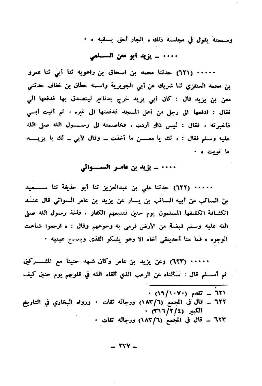 623 - وَعَنْ يَزِيدَ بْنِ عَامِرٍ وَكَان شَهِدَ حُنَيْنًا مَع الْمُشْرِكِينَ ثُمَّ أَسْلَمَ قَالَ: سَأَلْنَاهُ عَنِ §الرُّعْبِ الَّذِي أَلْقَاهُ اللهُ فِي قُلُوبِهِمْ يَوْمَ حُنَيْنٍ كَيْفَ كَانَ؟ فَأَخَذَ حَصَاةً فَرَمَى بِهَا طَشْتًا فَطَنَّ فَقَالَ: «كُنَّا نَجِدُ فِي أَجْوَافِنَا مِثْلَ ذَلِكَ»