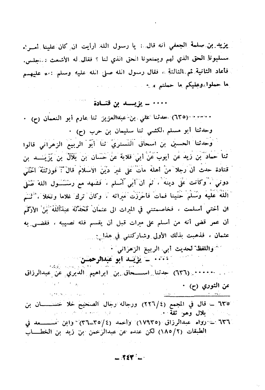635 - حَدَّثَنَا عَلِيُّ بْنُ عَبْدِ الْعَزِيزِ، ثَنَا عَارِمٌ أَبُو النُّعْمَانِ، ح وَحَدَّثَنَا أَبُو مُسْلِمٍ الكَشِّيُّ، ثَنَا سُلَيْمَانُ بْنُ حَرْبٍِ، ح وَحَدَّثَنَا الْحُسَيْنُ بْنُ إِسْحَاقَ التُّسْتَرِيُّ، ثَنَا أَبُو الرَّبِيعِ الزَّهْرَانِيُّ، قَالُوا: ثَنَا حَمَّادُ بْنُ زَيْدٍ، عَنْ أَيُّوبَ، عَنْ أَبِي قِلَابَةَ، عَنْ حَسَّانَ بْنِ بِلَالِ بْنِ يَزِيدَ بْنِ قَتَادَةَ، حَدَّثَ أَنَّ رَجُلًا مِنْ أَهْلِهِ مَاتَ وَهُو عَلَى غَيْرِ دِينِ الْإِسْلَامِ قَالَ: فَوَرِثَتْهُ أُخْتِي دُونِي وَكَانَتْ عَلَى دِينِهِ، ثُمَّ إِنَّ أَبِي أَسْلَمَ فَشَهِدَ مَعَ رَسُولِ اللهِ صَلَّى اللهُ عَلَيْهِ وَسَلَّمَ حُنَيْنًا فَمَاتَ فَأَحْرَزَتْ مِيرَاثَهُ وَكَانَ تَرَكَ غُلَامًا وَنَخْلًا، ثُمَّ إِنَّ أُخْتِي أَسْلَمَتْ فَخَاصَمَتْنِي فِي الْمِيرَاثِ إِلَى عُثْمَانَ فَحَدَّثَهُ عَبْدُ اللهِ بْنُ الْأَرْقَمِ أَنَّ عُمَرَ قَضَى أَنَّهُ §مَنْ أَسْلَمَ عَلَى مِيرَاثٍ قَبْلَ أَنْ يُقْسَمَ فَلَهُ نَصِيبُهُ فَقَضَى بِهِِ عُثْمَانُ فَذَهَبَتْ بِذَلِكَ الْأُولَى وَشَارَكَتْنِي فِي هَذَا " وَاللَّفْظُ لِحَدِيثِ أَبِي الرَّبِيعِ الزَّهْرَانِيِّ