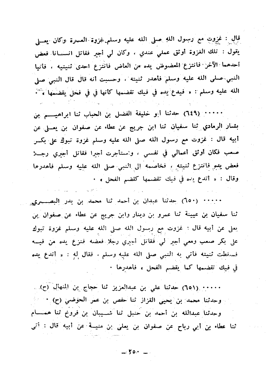 649 - حَدَّثَنَا أَبُو خَلِيفَةَ الْفَضْلُ بْنُ الْحُبَابِ، ثَنَا إِبْرَاهِيمُ بْنُ بَشَّارٍ الرَّمَادِيُّ، ثَنَا سُفْيَانُ، ثَنَا ابْنُ جُرَيْجٍ، عَنْ عَطَاءٍ، عَنْ صَفْوَانَ بْنِ يَعْلَى، عَنْ أَبِيهِ، قَالَ: غَزَوْتُ مَعَ رَسُولِ اللهِ صَلَّى اللهُ عَلَيْهِ وَسَلَّمَ غَزْوَةَ تَبُوكَ عَلَى بَكْرٍ صَعْبٍ فَكَانَ أَوْثَقَ أَعْمَالِي فِي نَفْسِي وَاسْتَأْجُرْتُ أَجِيرًا، فَقَاتَلَ أَجِيرِي رَجُلًا فَعَضَّ يَدَهُ فَانْتَزَعَ ثَنِيَّتَهُ فَخَاصَمَهُ إِلَى النَّبِيِّ صَلَّى اللهُ عَلَيْهِ وَسَلَّمَ فَأَهْدَرَهَا وَقَالَ: «§أَيَدَعُ يَدَهُ فِي فِيكَ تَقْضَمُهَا كَقَضْمِ الْفَحْلِ»
