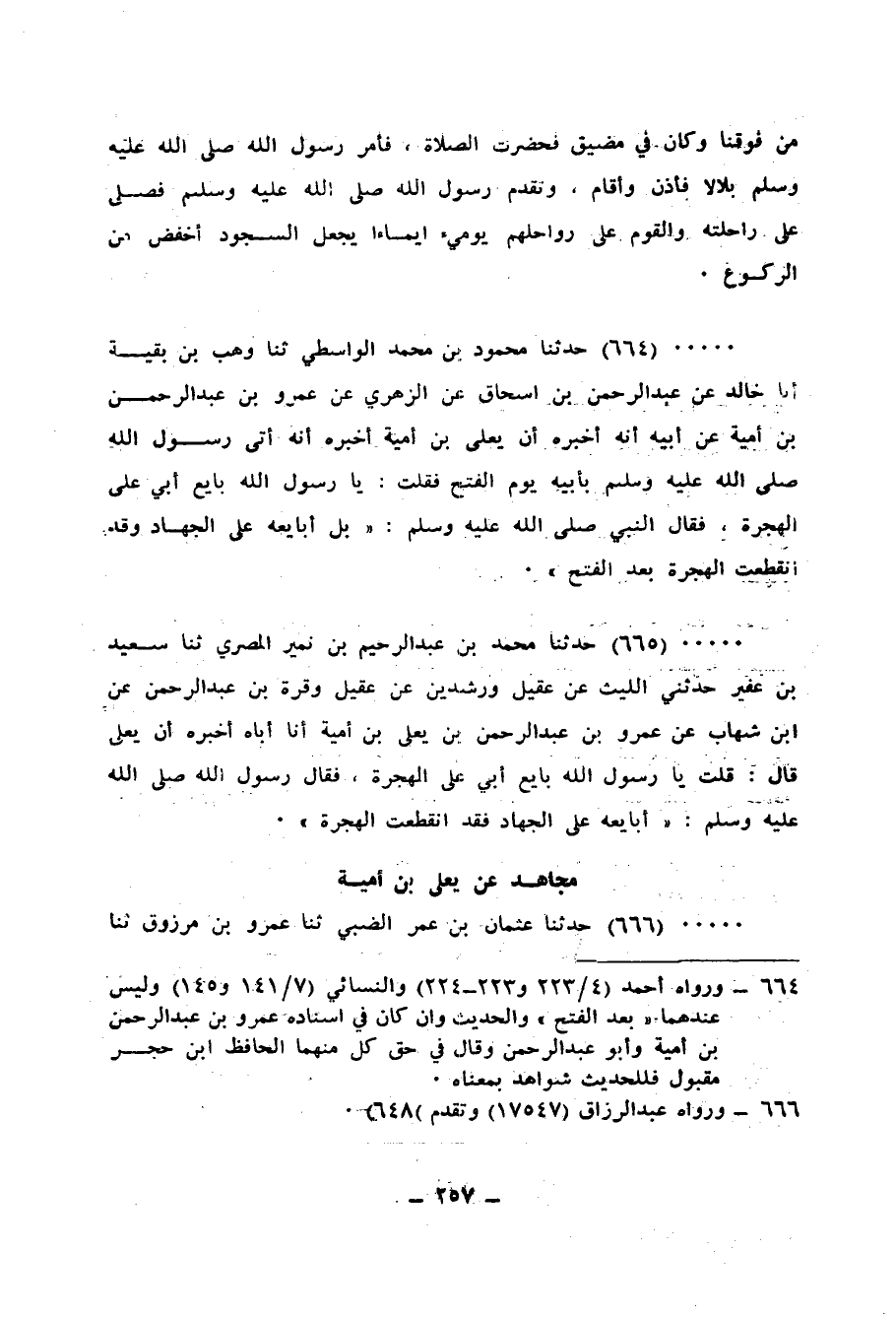 664- حَدَّثَنَا مَحْمُودُ بن مُحَمَّدٍ الْوَاسِطِيُّ ، حَدَّثَنَا وَهْبُ بن بَقِيَّةَ انا خَالِدُ ، عَنْ عَبْدِ الرَّحْمَنِ بن إِسْحَاقَ عَنِ الزُّهَرِيِّ عَنْ عَمْرِو بن عَبْدِ الرَّحْمَنِ بن أُمَيَّةَ ، عَنْ أَبِيهِ أَنَّهُ أَخْبَرَهُ أَنَّ يَعْلَى بن أُمَيَّةَ أَخْبَرَهُ أَنَّهُ أَتَى رَسُولُ اللهِ صَلَّى اللَّهُ عَلَيْهِ وَسَلَّمَ بِأَبِيهِ يَوْمَ الْفَتْحِ فَقُلْتُ : يَا رَسُولَ اللهِ بَايِعْ أَبِي عَلَى الْهِجْرَةِ فَقَالَ النَّبِيُّ صَلَّى اللَّهُ عَلَيْهِ وَسَلَّمَ بَلْ أُبَايِعُهُ عَلَى الْجِهَادِ وَقَدِ انْقَطَعَتِ الْهِجْرَةُ بَعْدَ الْفَتْحِ.