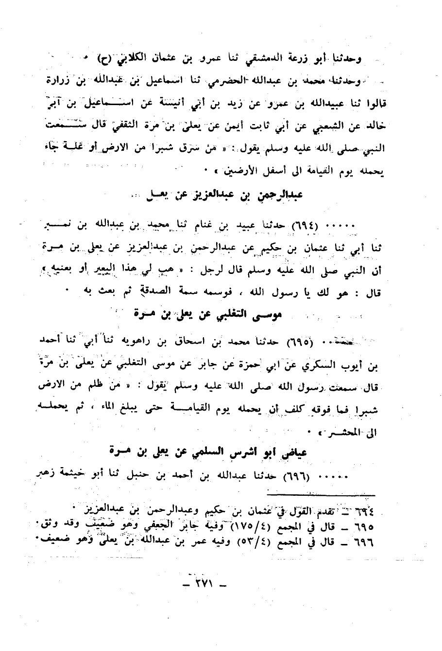 695 - حَدَّثَنَا مُحَمَّدُ بْنُ إِسْحَاقَ بْنِ رَاهَوَيْهِ، ثنا أَبِي، ثنا أَحْمَدُ بْنُ أَيُّوبَ السُّكَّرِيُّ، عَنْ أَبِي حَمْزَةَ، عَنْ جَابِرٍ، عَنْ مُوسَى التَّغْلِبِيِّ، عَنْ يَعْلَى بْنِ مُرَّةَ، قَالَ: سَمِعْتُ رَسُولَ اللهِ صَلَّى اللهُ عَلَيْهِ وَسَلَّمَ، يَقُولُ: «§مَنْ ظَلَمَ مِنَ الْأَرْضِ شِبْرًا، فَمَا فَوْقَهُ كُلِّفَ أَنْ يَحْمِلَهُ يَوْمَ الْقِيَامَةِ، حَتَّى يَبْلُغَ الْمَاءَ، ثُمَّ يَحْمِلُهُ إِلَى الْمَحْشَرِ»