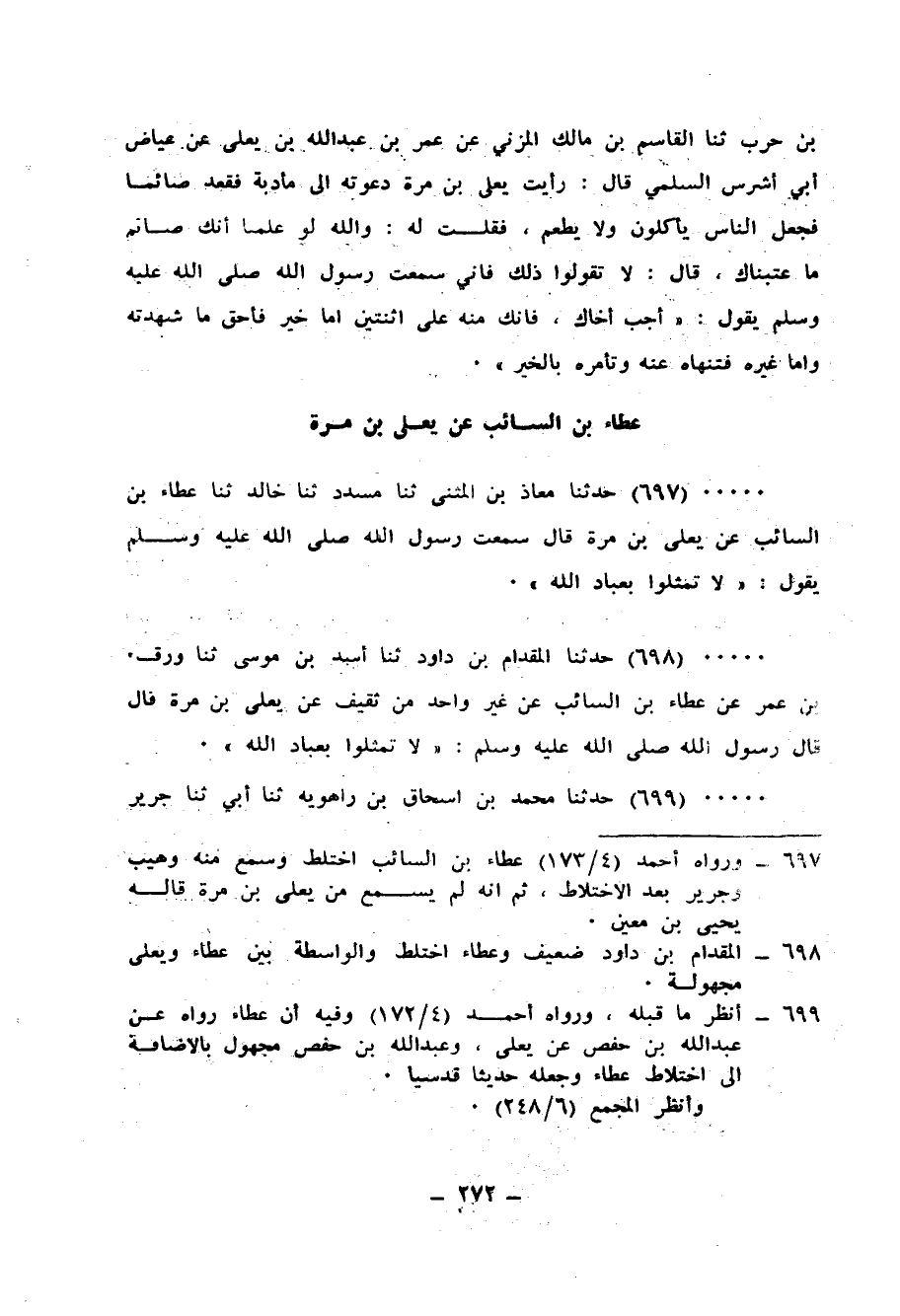 697 - حَدَّثَنَا مُعَاذُ بْنُ الْمُثَنَّى، ثنا مُسَدَّدٌ، ثنا خَالِدٌ، ثنا عَطَاءُ بْنُ السَّائِبِ، عَنْ يَعْلَى بْنِ مُرَّةَ، قَالَ: سَمِعْتُ رَسُولَ اللهِ صَلَّى اللهُ عَلَيْهِ وَسَلَّمَ يَقُولُ: «§لَا تُمَثِّلُوا بِعِبَادِ اللهِ»