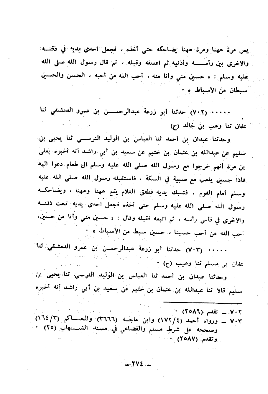 702 - حَدَّثَنَا أَبُو زُرْعَةَ عَبْدُ الرَّحْمَنِ بْنُ عَمْرٍو الدِّمَشْقِيُّ، ثنا عَفَّانُ، ثنا وُهَيْبُ بْنُ خَالِدٍ، ح وَحَدَّثَنَا عَبْدَانُ بْنُ أَحْمَدَ، ثنا الْعَبَّاسُ بْنُ الْوَلِيدِ النَّرْسِيُّ، ثنا يَحْيَى بْنُ سُلَيْمٍ، عَنْ عَبْدِ اللهِ بْنِ عُثْمَانَ بْنِ خُثَيْمٍ، عَنْ سَعِيدِ بْنِ أَبِي رَاشِدٍ، أَنَّهُ أَخْبَرَهُ يَعْلَى بْنُ مُرَّةَ، أَنَّهُمُ خَرَجُوا مَعَ رَسُولِ اللهِ صَلَّى اللهُ عَلَيْهِ وَسَلَّمَ إِلَى طَعَامٍ دُعُوا إِلَيْهِ، فَإِذَا حُسَيْنٌ يَلْعَبُ مَعَ صَبِيَّةٍ فِي السِّكَّةِ فَاسْتَقْبَلَهُ رَسُولُ اللهِ صَلَّى اللهُ عَلَيْهِ وَسَلَّمَ أَمَامَ الْقَوْمِ، فَشَبَّكَ يَدَيْهِ فَطَفِقَ الْغُلَامُ يَقَعُ هَهُنَا وَهَهُنَا وَيُضَاحِكُهُ رَسُولُ اللهِ صَلَّى اللهُ عَلَيْهِ وَسَلَّمَ حَتَّى أَخَذَهُ، فَجَعَلَ إِحْدَى يَدَيْهِ تَحْتَ ذَقَنِهِ وَالْأُخْرَى فِي فَأْسِ رَأْسِهِ ثُمَّ اتَّبَعَهُ فَقَبَّلَهُ، وَقَالَ: «§حُسَيْنٌ مِنِّي وَأَنَا مِنْ حُسَيْنٍ أَحَبَّ اللهُ مَنْ أَحَبَّ حُسَيْنًا حُسَيْنٌ سِبْطٌ مِنَ الْأَسْبَاطِ»
