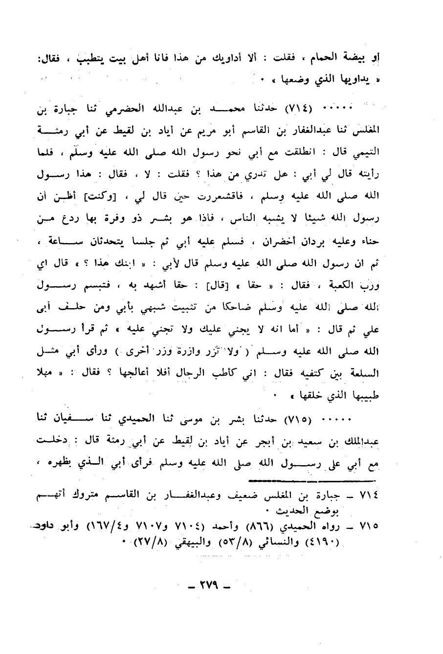 715 - حَدَّثَنَا بِشْرُ بْنُ مُوسَى، ثنا الْحُمَيْدِيُّ، ثنا سُفْيَانُ، ثنا عَبْدُ الْمَلِكِ بْنُ سَعِيدِ بْنِ أَبْجَرَ، عَنْ إِيَادِ بْنِ لَقِيطٍ، عَنْ أَبِي رِمْثَةَ، قَالَ: دَخَلْتُ مَعَ أَبِي عَلَى رَسُولِ اللهِ صَلَّى اللهُ عَلَيْهِ وَسَلَّمَ فَرَأَى أَبِي الَّذِي بِظَهْرِهِ فَقَالَ: دَعْنِي أُعَالِجُ مَا بِظَهْرِكَ فَإِنِّي طَبِيبٌ، قَالَ: «أَنْتَ رَفِيقٌ، وَاللهُ الطَّبِيبُ» قَالَ: وَقَالَ رَسُولُ اللهِ صَلَّى اللهُ عَلَيْهِ وَسَلَّمَ لِأَبِي: «مَنْ ذَا مَعَكَ؟» قَالَ: ابْنِي، أَشْهَدُ لَكَ بِهِ فَقَالَ النَّبِيُّ صَلَّى اللهُ عَلَيْهِ وَسَلَّمَ: «§أَمَا إِنَّكَ لَا تَجْنِي عَلَيْهِ وَلَا يَجْنِي عَلَيْكَ» وَذَكَرَ أَنَّهُ رَأَى بِرَسُولِ اللهِ صَلَّى اللهُ عَلَيْهِ وَسَلَّمَ رَدْعَ الْحِنَّاءِ "