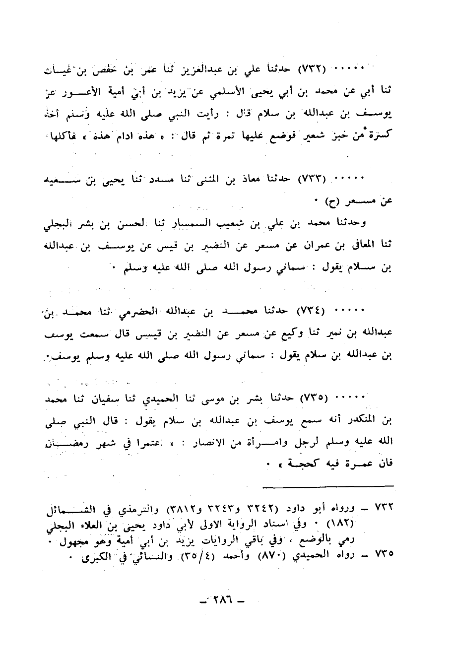735 - حَدَّثَنَا بِشْرُ بْنُ مُوسَى، ثنا الْحُمَيْدِيُّ، ثنا سُفْيَانُ، ثنا مُحَمَّدُ بْنُ الْمُنْكَدِرِ، أَنَّهُ سَمِعَ يُوسُفَ بْنَ عَبْدِ اللهِ بْنِ سَلَّامٍ يَقُولُ: قَالَ النَّبِيُّ صَلَّى اللهُ عَلَيْهِ وَسَلَّمَ لِرَجُلٍ وَامْرَأَةٍ مِنَ الْأَنْصَارِ: «§اعْتَمِرَا فِي شَهْرِ رَمَضَانَ، فَإِنَّ عُمْرَةً فِيهِ كَحَجَّةٍ»