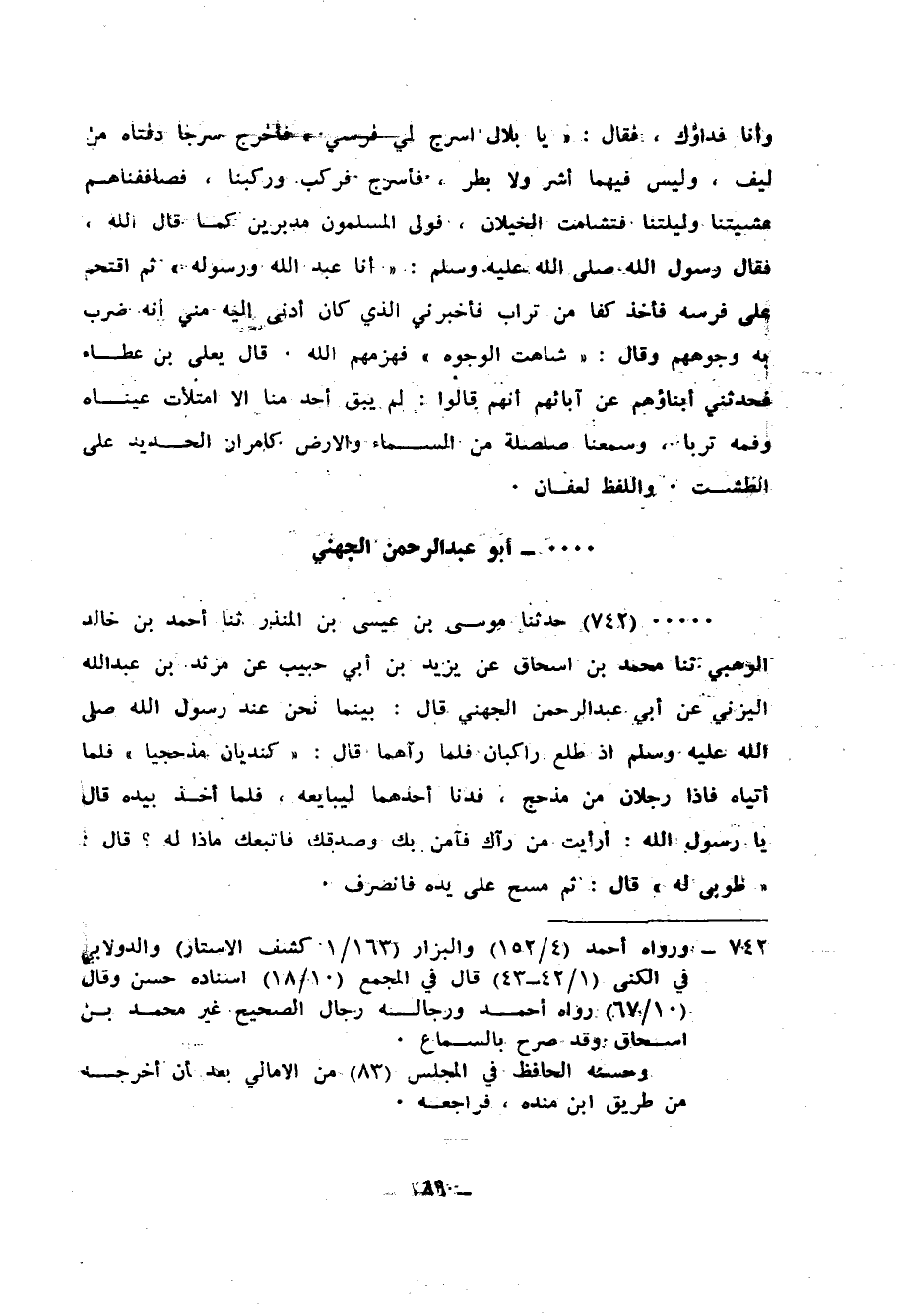 742 - حَدَّثَنَا مُوسَى بْنُ عِيسَى بْنُ الْمُنْذِرِ، ثنا أَحْمَدُ بْنُ خَالِدٍ الْوَهْبِيُّ، ثنا مُحَمَّدُ بْنُ إِسْحَاقَ، عَنْ يَزِيدَ بْنِ أَبِي حَبِيبٍ، عَنْ مَرْثَدِ بْنِ عَبْدِ اللهِ الْيَزَنِيِّ، عَنْ أَبِي عَبْدِ الرَّحْمَنِ الْجُهَنِيِّ، قَالَ: بَيْنَمَا نَحْنُ عِنْدَ رَسُولِ اللهِ صَلَّى اللهُ عَلَيْهِ وَسَلَّمَ إِذْ طَلَعَ رَاكِبَانِ، فَلَمَّا رَآهُمَا قَالَ: «§كِنْدِيَّانِ مَذْحِجِيَّانِ» فَلَمَّا أَتَيَاهُ فَإِذَا رَجُلَانِ مِنْ مَذْحِجٍ فَدَنَا أَحَدُهُمَا لِيُبَايِعَهُ، فَلَمَّا أَخَذَ بِيَدِهِ "، قَالَ: يَا رَسُولَ اللهِ أَرَأَيْتَ مَنْ رَآكَ فَآمَنَ بِكَ وَصَدَّقَكَ فَاتَّبَعَكَ؟ مَاذَا لَهُ؟، قَالَ: «طُوبَى لَهُ» ، قَالَ: «ثُمَّ مَسَحَ عَلَى يَدِهِ فَانْصَرَفَ»