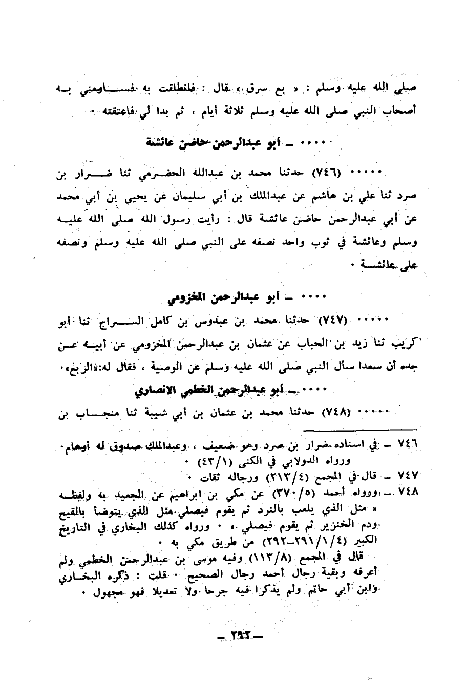 747 - حَدَّثَنَا مُحَمَّدُ بْنُ عَبْدُوسِ بْنِ كَامِلٍ السَّرَّاجُ، ثنا أَبُو كُرَيْبٍ، ثنا زَيْدُ بْنُ الْحُبَابِ، عَنْ عُثْمَانَ بْنِ عَبْدِ الرَّحْمَنِ الْمَخْزُومِيِّ، عَنْ أَبِيهِ، عَنْ جَدِّهِ: أَنَّ سَعْدًا §سَأَلَ النَّبِيَّ صَلَّى اللهُ عَلَيْهِ وَسَلَّمَ عَنِ الْوَصِيَّةِ، فَقَالَ: «لَهُ الرُّبُعُ»