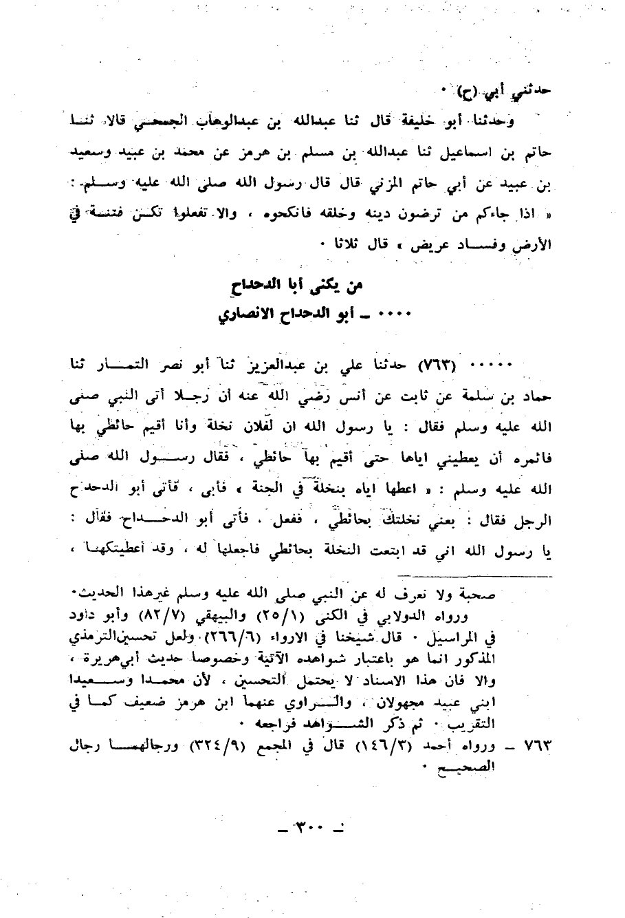 763 - حَدَّثَنَا عَلِيُّ بْنُ عَبْدِ الْعَزِيزِ، ثنا أَبُو نَصْرٍ التَّمَّارُ، ثنا حَمَّادُ بْنُ سَلَمَةَ، عَنْ ثَابِتٍ، عَنْ أَنَسٍ، رَضِيَ اللهُ عَنْهُ أَنَّ رَجُلًا أَتَى النَّبِيَّ صَلَّى اللهُ عَلَيْهِ وَسَلَّمَ فَقَالَ: يَا رَسُولَ اللهِ إِنَّ لِفُلَانٍ نَخْلَةً وَأَنَا أُقِيمُ حَائِطِي بِهَا فَأَمْرُهْ أَنْ يُعْطِينِي إِيَّاهَا حَتَّى أُقِيمَ بِهَا حَائِطِي فَقَالَ رَسُولُ اللهِ صَلَّى اللهُ عَلَيْهِ وَسَلَّمَ: «§أَعْطِهَا إِيَّاهُ بِنَخْلَةٍ فِي الْجَنَّةِ» فَأَبَى فَأَتَى أَبُو الدَّحْدَاحِ الرَّجُلَ، فَقَالَ: بِعْنِي نَخْلَتَكَ بِحَائِطِي، فَفَعَلَ، فَأَتَى أَبُو الدَّحْدَاحِ فَقَالَ: يَا رَسُولَ اللهِ «إِنِّي قَدِ ابْتَعْتُ النَّخْلَةَ بِحَائِطِي، فَاجْعَلْهَا لَهُ وَقَدْ أَعْطَيْتُكَهَا» فَقَالَ رَسُولُ اللهِ صَلَّى اللهُ عَلَيْهِ وَسَلَّمَ: «كَمْ مِنْ عِذْقِ رَدَاحٍ لِأَبِي الدَّحْدَاحِ مِرَارًا» ، فَأَتَى أَبُو الدَّحْدَاحِ امْرَأَتَهُ، فَقَالَ: يَا أُمَّ الدَّحْدَاحِ اخْرُجِي مِنَ الْحَائِطِ فَقَدْ بِعْتُهُ بِنَخْلَةٍ فِي الْجَنَّةِ، فَقَالَتْ: رَبِحَ الْبَيْعُ أَوْ كَلِمَةً تُشْبِهُهَا