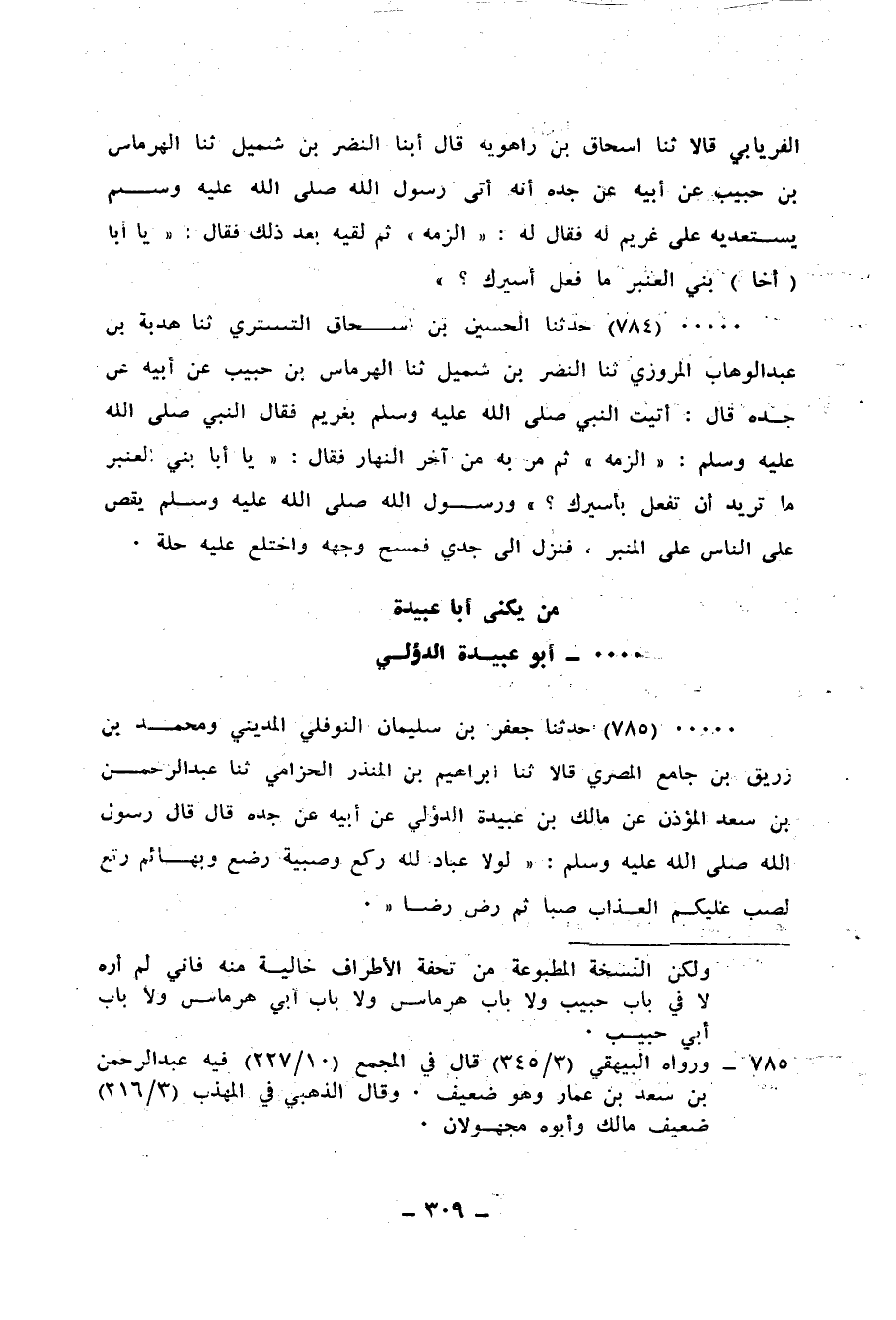 784 - حَدَّثَنَا الْحُسَيْنُ بْنُ إِسْحَاقَ التُّسْتَرِيُّ، ثنا هَدِيَّةُ بْنُ عَبْدِ الْوَهَّابِ الْمَرْوَزِيُّ، ثنا النَّضْرُ بْنُ شُمَيْلٍ، ثنا الْهِرْمَاسُ بْنُ حَبِيبٍ، عَنْ أَبِيهِ، عَنْ جَدِّهِ، قَالَ: أَتَيْتُ النَّبِيَّ صَلَّى اللهُ عَلَيْهِ وَسَلَّمَ بِغَرِيمٍ فَقَالَ النَّبِيُّ صَلَّى اللهُ عَلَيْهِ وَسَلَّمَ: «§الْزَمْهُ، ثُمَّ مَرَّ بِهِ مِنْ آخِرِ النَّهَارِ» فَقَالَ: «يَا أَخَا بَنِي الْعَنْبَرِ، مَا تُرِيدُ أَنْ تَفْعَلَ بِأَسِيرِكَ؟» وَرَسُولُ اللهِ صَلَّى اللهُ عَلَيْهِ وَسَلَّمَ يَقُصُّ عَلَى النَّاسِ عَلَى الْمِنْبَرِ فَنَزَلَ إِلَى جَدِّي فَمَسَحَ وَجْهَهُ وَاخْتَلَعَ عَلَيْهِ حُلَّةً