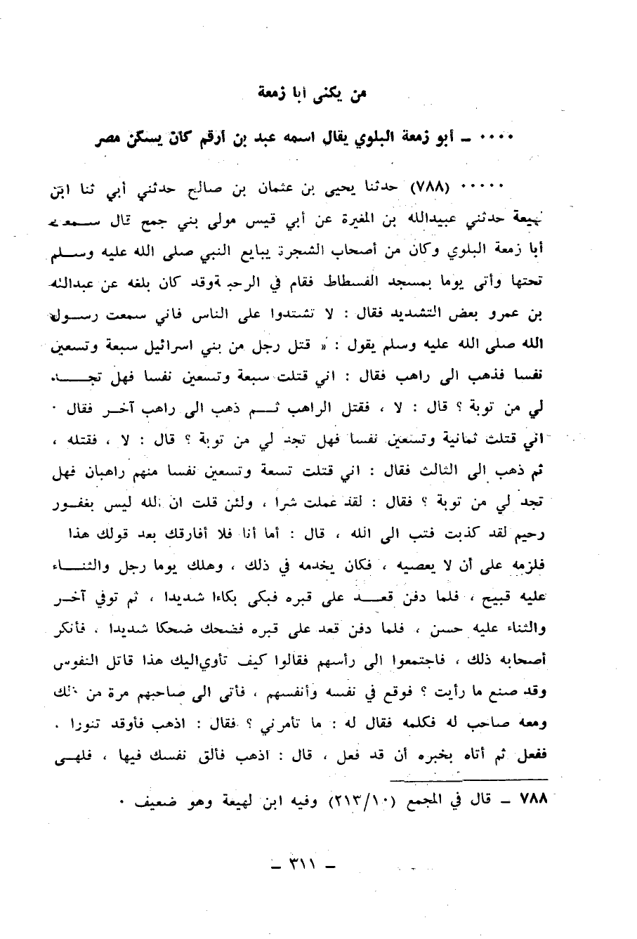 788 - حَدَّثَنَا يَحْيَى بْنُ عُثْمَانَ بْنِ صَالِحٍ، حَدَّثَنِي أَبِي، ثنا ابْنُ لَهِيعَةَ، حَدَّثَنِي عُبَيْدُ اللهِ بْنُ الْمُغِيرَةِ، عَنْ أَبِي قَيْسٍ، مَوْلَى بَنِي جُمَحٍ، قَالَ: سَمِعْتُ أَبَا زَمْعَةَ الْبَلَوِيَّ، وَكَانَ مِنْ أَصْحَابِ الشَّجَرَةِ يُبَايِعُ النَّبِيَّ صَلَّى اللهُ عَلَيْهِ وَسَلَّمَ تَحْتَهَا وَأَتَى يَوْمًا بِمَسْجِدِ الْفُسْطَاطِ فَقَامَ فِي الرَّحَبَةِ وَقَدْ كَانَ بَلَغَهُ، عَنْ عَبْدِ اللهِ بْنِ عَمْرٍو بَعْضُ التَّشْدِيدِ، فَقَالَ: لَا تَشْتَدُّوا عَلَى النَّاسِ، فَإِنِّي سَمِعْتُ رَسُولَ اللهِ صَلَّى اللهُ عَلَيْهِ وَسَلَّمَ يَقُولُ: «§قَتَلَ رَجُلٌ مِنْ بَنِي إِسْرَائِيلَ سَبْعَةً وَتِسْعِينَ نَفْسًا فَذَهَبَ إِلَى رَاهِبٍ» ، فَقَالَ: إِنِّي قَتَلْتُ سَبْعَةً وَتِسْعِينَ نَفْسًا فَهَلْ تَجِدُ لِي مِنْ تَوْبَةٍ؟ قَالَ: لَا، فَقَتَلَ الرَّاهِبَ، ثُمَّ ذَهَبَ إِلَى رَاهِبٍ آخَرَ، فَقَالَ: إِنِّي قَتَلْتُ ثَمَانِيَةً وَتِسْعِينَ نَفْسًا، فَهَلْ تَجِدُ لِي مِنْ تَوْبَةٍ؟، قَالَ: لَا فَقَتَلَهُ، ثُمَّ ذَهَبَ إِلَى الثَّالِثِ فَقَالَ: إِنِّي قَتَلْتُ تِسْعَةً وَتِسْعِينَ نَفْسًا مِنْهُمْ رَاهِبَانِ، فَهَلْ تَجِدُ لِي مِنْ تَوْبَةٍ؟، فَقَالَ: لَقَدْ عَمِلَتْ شَرًّا وَلَئِنْ قُلْتُ: «إِنَّ اللهَ لَيْسَ بِغَفُورٍ رَحِيمٍ لَقَدْ كَذَبْتُ فَتُبْ إِلَى اللهِ» ، قَالَ: أَمَّا أَنَا فَلَا أُفَارِقُكَ بَعْدَ قَوْلِكَ هَذَا، فَلَزِمَهُ عَلَى أَنْ لَا يَعْصِيَهُ فَكَانَ يَخْدُمُهُ فِي ذَلِكَ وَهَلَكَ يَوْمًا رَجُلٌ وَالثَّنَاءُ عَلَيْهِ قَبِيحٌ، فَلَمَّا دُفِنَ قَعَدَ عَلَى قَبْرِهِ فَبَكَى بُكَاءً شَدِيدًا، ثُمَّ تُوُفِّيَ آخَرُ وَالثَّنَاءُ عَلَيْهِ حَسَنٌ فَلَمَّا دُفِنَ قَعَدَ عَلَى قَبْرِهِ فَضَحِكَ ضَحِكًا شَدِيدًا فَأَنْكَرَ أَصْحَابُهُ ذَلِكَ، فَاجْتَمَعُوا إِلَى رَأْسِهِمْ، فَقَالُوا: كَيْفَ تَأْوِي إِلَيْكَ هَذَا قَاتَلُ النُّفُوسِ؟ وَقَدْ صَنَعَ مَا رَأَيْتَ فَوَقَعَ فِي نَفْسِهِ وَأَنْفُسِهِمْ فَأَتَى إِلَى صَاحِبِهِمْ مَرَّةً مِنْ ذَلِكَ، وَمَعَهُ صَاحِبٌ لَهُ فَكَلَّمَهُ فَقَالَ لَهُ: مَا تَأْمُرُونِي؟، فَقَالَ: اذْهَبْ فَأَوْقِدْ تَنُّورًا فَفَعَلَ ثُمَّ أَتَاهُ بِخَبَرِهِ أَنْ قَدَ فَعَلَ، قَالَ: " اذْهَبْ فَأَلْقِ نَفْسَكَ فِيهَا فَلَهِيَ عَنْهُ الرَّاهِبُ، وَذَهَبَ الْآخَرُ فَأَلْقَى نَفْسَهُ فِي التَّنُّورِ، ثُمَّ اسْتَفَاقَ الرَّاهِبُ، فَقَالَ: «إِنِّي لَأَظُنُّ الرَّجُلَ قَدْ أَلْقَى نَفْسَهُ فِي التَّنُّورِ بِقَوْلِي لَهُ» ، فَذَهَبَ إِلَيْهِ فَوَجَدَهُ حَيًّا فِي التَّنُّورِ يَعْرَقُ فَأَخَذَ بِيَدِهِ فَأَخْرَجَهُ مِنَ التَّنُّورِ، فَقَالَ: «مَا يَنْبَغِي أَنْ تَخْدِمَنِي وَلَكِنْ أَنَا أَخْدِمُكَ أَخْبَرَنِي عَنْ بُكَائِكَ عَلَى الْمُتَوَفَّى الْأَوَّلِ، وَعَنْ ضَحَكِكَ عَلَى الْآخَرِ» ، قَالَ: أَمَّا الْأَوَّلُ فَإِنَّهُ لَمَّا دُفِنَ رَأَيْتُ مَا يَلْقَى مِنَ الشَّرِّ فَذَكَرْتُ ذُنُوبِي فَبَكَيْتُ، وَأَمَّا الْآخَرُ فَإِنِّي رَأَيْتُ مَا يَلْقَى بِهِ مِنَ الْخَيْرِ فَضَحِكْتُ، وَكَانَ بَعْدَ ذَلِكَ مِنْ عُظَمَاءِ بَنِي إِسْرَائِيلَ