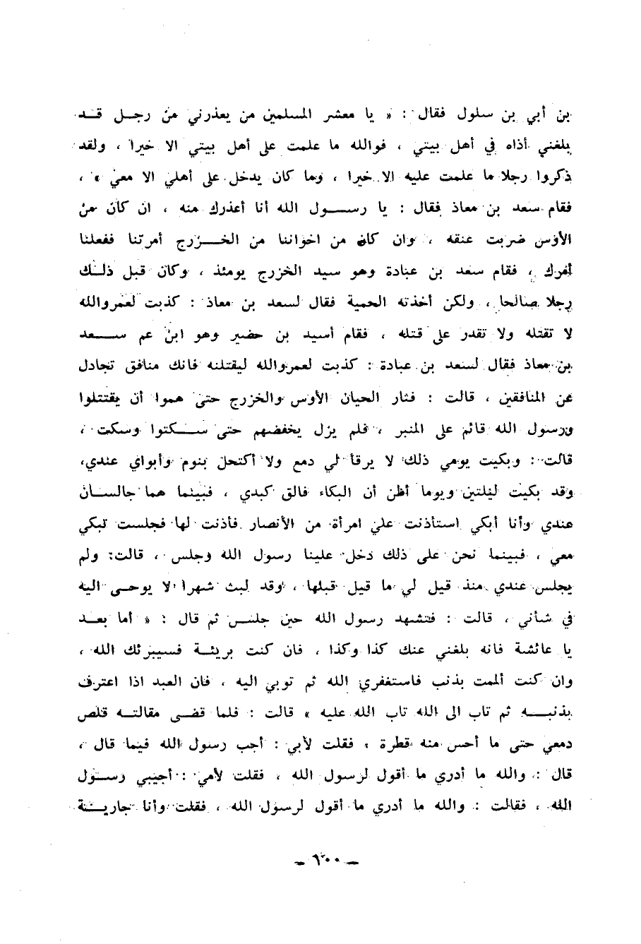 ، فَقَالَ : يَا مَعْشَرَ الْمُسْلِمِينَ مَنْ يَعْذُرُنِي مِنْ رَجُلٍ قَدْ بَلَغَنِي أَذَاهُ فِي أَهْلِ بَيْتِي ، فَوَاللَّهِ مَا عَلِمْتُ عَلَى أَهْلِ بَيْتِي إِلاَّ خَيْرًا ، وَلَقَدْ ذَكَرُوا رَجُلاً مَا عَلِمْتُ عَلَيْهِ إِلاَّ خَيْرًا ، وَمَا كَانَ يَدْخُلُ عَلَى أَهْلِي إِلاَّ مَعِي ، فَقَامَ سَعْدُ بْنُ مُعَاذٍ فَقَالَ : يَا رَسُولَ اللهِ أَنَا أَعْذُرُكَ مِنْهُ إِنْ كَانَ مِنَ الأَوْسِ ضَرَبْتُ عُنُقَهُ ، وَإِنْ كَانَ مِنْ إِخْوَانِنَا مِنَ الْخَزْرَجِ أَمَرْتَنَا فَفَعَلْنَا أَمْرَكَ ، فَقَامَ سَعْدُ بْنُ عُبَادَةَ وَهُوَ سَيِّدُ الْخَزْرَجِ يَوْمَئِذٍ ، وَكَانَ قَبْلَ ذَلِكَ رَجُلاً صَالِحًا وَلَكِنْ أَخَذْتُهُ الْحَمِيَّةُ ، فَقَالَ لِسَعْدِ بْنِ مُعَاذٍ : كَذَبْتَ لَعَمْرُ اللهِ لاَ تَقْتُلُهُ ، وَلاَ تَقْدِرُ عَلَى قَتْلِهِ ، فَقَامَ أُسَيْدُ بْنُ حُضَيْرٍ وَهُوَ ابْنُ عَمِّ سَعْدِ بْنِ مُعَاذٍ ، فَقَالَ لِسَعْدِ بْنِ عُبَادَةَ : كَذَبْتَ لَعَمْرُ اللهِ لَيَقْتُلَنَّهُ ، فَإِنَّكَ مُنَافِقٌ تُجَادِلُ عَنِ الْمُنَافِقِينَ ، قَالَتْ : فَثَارَ الْحَيَّانِ الأَوْسُ وَالْخَزْرَجُ حَتَّى هَمُّوا أَنْ يَقْتَتِلُوا ، وَرَسُولُ اللهِ قَائِمٌ عَلَى الْمِنْبَرِ فَلَمْ يَزَلْ يُخَفِّضُهُمْ حَتَّى سَكَتُوا وَسَكَتَ ، قَالَتْ : وَبَكَيْتُ يَوْمِي ذَلِكَ لاَ يَرْقَأُ لِي دَمْعٌ وَلاَ أَكْتَحِلُ بِنَوْمٍ ، وَأَبَوَايَ عِنْدِي ، وَقَدْ بَكَيْتُ لَيْلَتَيْنِ وَيَوْمًا أَظُنُّ أَنَّ الْبُكَاءَ فَالِقٌ كَبِدِي ، فَبَيْنَمَا هُمَا جَالِسَانِ عِنْدِي وَأَنَا أَبْكِي اسْتَأْذَنَتْ عَلَيَّ امْرَأَةٌ مِنَ الأَنْصَارِ فَأَذِنْتُ لَهَا ، فَجَلَسَتْ تَبْكِي مَعِي ، فَبَيْنَمَا نَحْنُ عَلَى ذَلِكَ دَخَلَ عَلَيْنَا رَسُولُ اللهِ وَجَلَسَ ، قَالَتْ : وَلَمْ يَجْلِسْ عِنْدِي مُنْذُ قِيلَ لِي مَا قِيلَ قَبْلَهَا ، وَقَدْ لَبِثَ شَهْرًا لاَ يُوحَى إِلَيْهِ فِي شَأْنِي ، قَالَتْ : فَتَشَهَّدَ رَسُولُ اللهِ حِينَ جَلَسَ ، ثُمَّ قَالَ : أَمَّا بَعْدُ يَا عَائِشَةُ ، فَإِنَّهُ بَلَغَنِي عَنْكِ كَذَا وَكَذَا ، فَإِنْ كُنْتِ بَرِيئَةً فَسَيُبَرِّئُكِ اللَّهُ ، وَإِنْ كُنْتِ أَلْمَمْتِ بِذَنْبٍ فَاسْتَغْفِرِي اللَّهَ ، ثُمَّ تُوبِي إِلَيْهِ ، فَإِنَّ الْعَبْدَ إِذَا اعْتَرَفَ بِذَنَبِهِ ثُمَّ تَابَ إِلَى اللهِ تَابَ اللَّهُ عَلَيْهِ ، قَالَتْ : فَلَمَّا قَضَى رَسُولُ اللهِ مَقَالَتَهُ قَلَصَ دَمْعِي حَتَّى مَا أُحِسُّ مِنْهُ قَطْرَةً ، فَقُلْتُ لأَبِي : أَجِبْ رَسُولَ اللهِ فِيمَا قَالَ ، قَالَ : وَاللَّهِ مَا أَدْرِي مَا أَقُولُ لِرَسُولِ اللهِ ، فَقُلْتُ لأُمِّي : أَجِيبِي رَسُولَ اللهِ ، فَقَالَتْ : وَاللَّهِ مَا أَدْرِي مَا أَقُولُ لِرَسُولِ اللهِ ، فَقُلْتُ وَأَنَا جَارِيَةٌ حَدِيثَةُ السِّنِّ ، لاَ أَقْرَأُ كَثِيرًا مِنَ الْقُرْآنِ