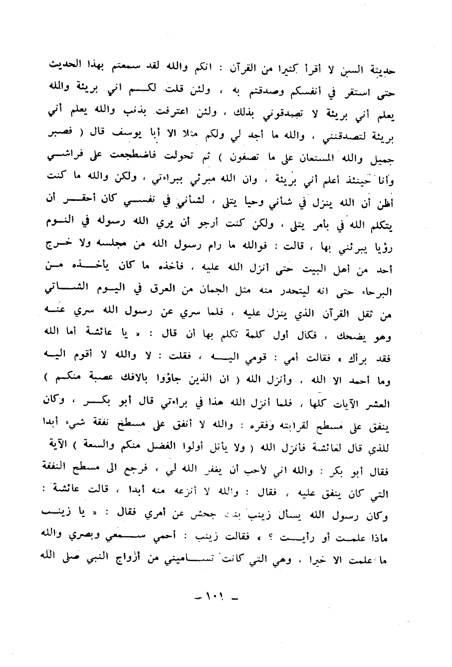 : إِنَّكُمْ وَاللَّهِ لَقَدْ سَمِعْتُمْ بِهَذَا الْحَدِيثِ حَتَّى اسْتَقَرَّ فِي أَنْفُسِكُمْ وَصَدَّقْتُمْ بِهِ ، وَلَئِنْ قُلْتُ لَكُمْ إِنِّي بَرِيئَةٌ وَاللَّهُ يَعْلَمُ أَنِّي بَرِيئَةٌ لاَ تُصَدِّقُونَنِي بِذَلِكَ ، وَلَئِنِ اعْتَرَفَتُ بِذَنْبٍ وَاللَّهُ يَعْلَمُ أَنِّي بَرِيئَةٌ لَتُصَدِّقُنَّنِي ، وَاللَّهِ مَا أَجِدُ لِي وَلَكُمْ مَثَلاً إِلاَّ أَبَا يُوسُفَ ، قَالَ : {فَصَبَرٌ جَمِيلٌ وَاللَّهُ الْمُسْتَعَانُ عَلَى مَا تَصِفُونَ} ثُمَّ تَحَوَّلْتُ فَاضْطَجَعْتُ عَلَى فِرَاشِي ، وَأَنَا حِينَئِذٍ أَعْلَمُ أَنِّي بَرِيئَةٌ ، وَأَنَّ اللَّهَ مُبَرِّئِي بِبَرَاءَتِي ، وَلَكِنْ وَاللَّهِ مَا كُنْتُ أَظُنُّ أَنَّ اللَّهَ يُنْزِلُ فِي شَأْنِي وَحْيًا يُتْلَى ، لَشَأْنِي فِي نَفْسِي كَانَ أَحْقَرَ أَنْ يَتَكَلَّمَ اللَّهُ فِيَّ بِأَمْرٍ يُتْلَى ، وَلَكِنْ كُنْتُ أَرْجُو أَنْ يُرِيَ اللَّهُ رَسُولَهُ فِي النَّوْمِ رُؤْيَا يُبَرِّئُنِي بِهَا ، قَالَتْ : فَوَاللَّهِ مَا رَامَ رَسُولُ اللهِ مِنْ مَجْلِسِهِ ، وَلاَ خَرَجَ أَحَدٌ مِنْ أَهْلِ الْبَيْتِ حَتَّى أَنْزَلَ اللَّهُ عَلَيْهِ ، فَأَخَذَهُ مَا كَانَ يَأْخُذُهُ مِنَ الْبُرَحَاءِ حَتَّى أَنَّهُ لَيَتَحَدَّرُ مِنْهُ مِثْلُ الْجُمَانِ مِنَ الْعَرَقِ فِي الْيَوْمِ الشَّاتِي مِنْ ثِقَلِ الْقُرْآنِ الَّذِي يُنَزَّلَ عَلَيْهِ ، فَلَمَّا سُرِّيَ عَنْ رَسُولِ اللهِ سُرِّيَ عَنْهُ وَهُوَ يَضْحَكُ ، فَكَانَ أَوَّلَ كَلِمَةٍ تَكَلَّمَ بِهَا ، أَنْ قَالَ : يَا عَائِشَةُ أَمَّا اللَّهُ فَقَدْ بَرَّأَكِ ، فَقَالَتْ أُمِّي : قَوْمِي إِلَيْهِ ، فَقُلْتُ : لاَ وَاللَّهِ لاَ أَقُومُ إِلَيْهِ وَمَا أَحْمَدُ إِلاَّ اللَّهَ ، وَأَنْزَلَ اللَّهُ {إِنَّ الَّذِينَ جَاؤُوا بِالإِفْكِ عُصْبَةٌ مِنْكُمْ} - الْعَشْرَ الآيَاتِ كُلَّهَا ، فَلَمَّا أَنْزَلَ اللَّهُ هَذَا فِي بَرَاءَتِي ، قَالَ أَبُو بَكْرٍ وَكَانَ يُنْفِقُ عَلَى مِسْطَحٍ لِقَرَابَتِهِ وَفَقْرِهِ : وَاللَّهِ لاَ أُنْفِقُ عَلَى مِسْطَحٍ نَفَقَةَ شَيْءٍ أَبَدًا لِلَّذِي قَالَ لِعَائِشَةَ ، فَأَنْزَلَ اللَّهُ {وَلاَ يَأْتَلِ أُولُو الْفَضْلِ مِنْكُمْ وَالسَّعَةِ} الآيَةَ ، فَقَالَ أَبُو بَكْرٍ : وَاللَّهِ إِنِّي لأُحِبُّ أَنْ يَغْفِرَ اللَّهُ لِي ، فَرَجَعَ إِلَى مِسْطَحٍ النَّفَقَةَ الَّتِي كَانَ يُنْفِقُ عَلَيْهِ ، فَقَالَ : وَاللَّهِ لاَ أَنْزِعُهُ مِنْهُ أَبَدًا ، قَالَتْ عَائِشَةُ : وَكَانَ رَسُولُ اللهِ يَسْأَلُ زَيْنَبَ بِنْتَ جَحْشٍ ، عَنْ أَمْرِي ، فَقَالَ : يَا زَيْنَبُ مَاذَا عَلِمْتِ ، أَوْ رَأَيْتِ ؟ فَقَالَتْ زَيْنَبُ : أَحْمِي سَمْعِي وَبَصَرِي ، وَاللَّهِ مَا عَلِمْتُ إِلاَّ خَيْرًا ، وَهِيَ الَّتِي كَانَتْ تُسَامِينِي مِنْ أَزْوَاجِ النَّبِيِّ صَلَّى اللَّهُ عَلَيْهِ وَسَلَّمَ ، فَعَصَمَهَا اللَّهُ بِالْوَرَعِ ، وَطَفِقَتْ أُخْتُهَا حَمْنَةُ تُحَارِبُ لَهَا فَهَلَكَتْ فِيمَنْ هَلَكَ مِنْ أَصْحَابِ الإِفْكِ ، قَالَ الزُّهْرِيُّ : فَهَذَا مَا انْتَهَى إِلَيْنَا مِنْ حَدِيثِ هَؤُلاَءِ الرَّهْطِ .
