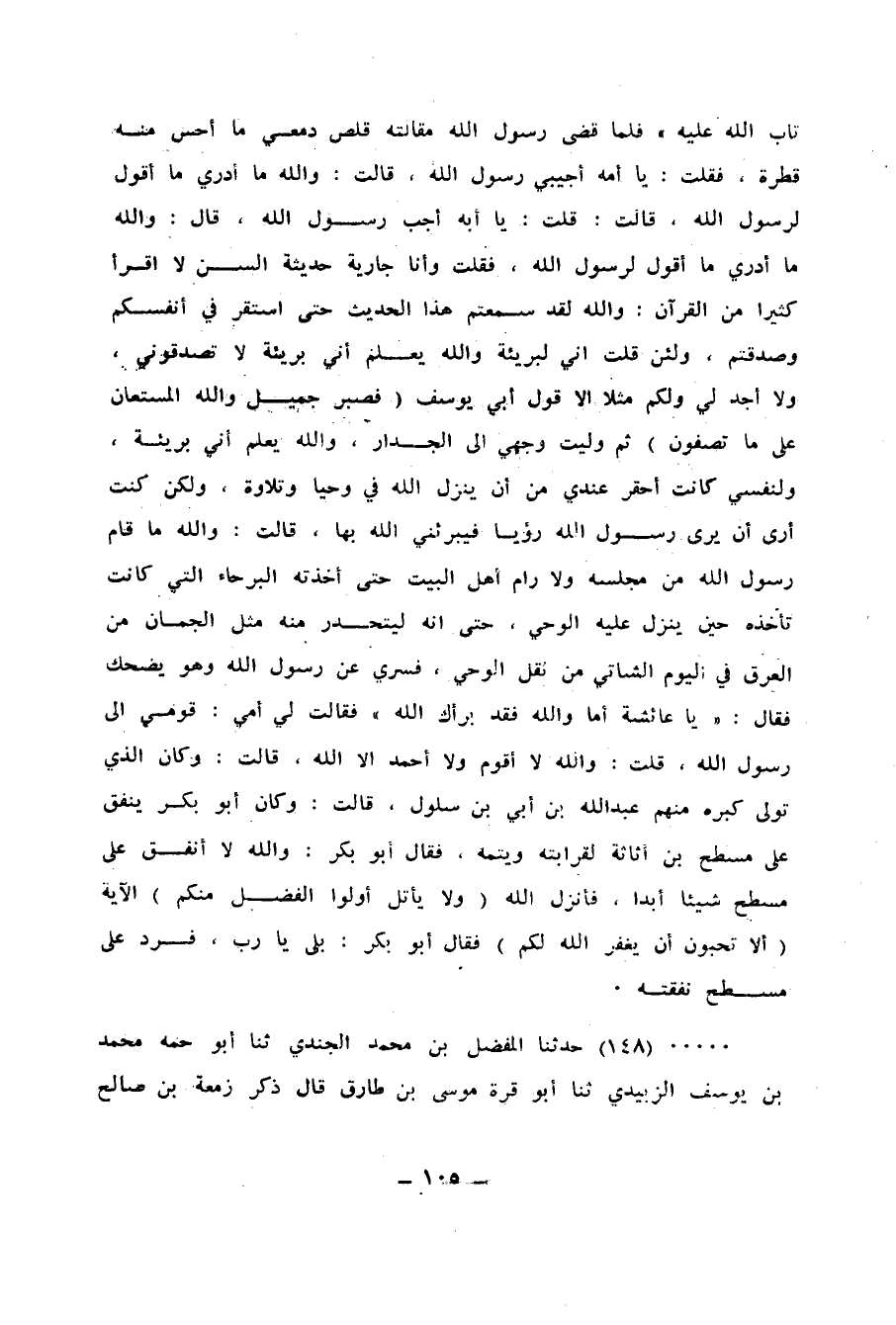 148- حَدَّثَنَا الْمُفَضَّلُ بْنُ مُحَمَّدٍ الْجَنَدِيُّ ، حَدَّثَنَا أَبُو حُمَةَ مُحَمَّدُ بْنُ يُوسُفَ الزُّبَيْدِيُّ ، حَدَّثَنَا أَبُو قُرَّةَ مُوسَى بْنُ طَارِقٍ ، قَالَ : ذَكَرَ زَمْعَةُ بْنُ صَالِحٍ ، عَنْ يَعْقُوبَ بْنِ عَطَاءٍ ، وَزِيَادِ بْنِ سَعْدٍ ، عَنِ ابْنِ شِهَابٍ ، عَنْ سَعِيدِ بْنِ الْمُسَيَّبِ ، وَعُرْوَةَ بْنِ الزُّبَيْرِ ، وَعَلْقَمَةَ بْنِ وَقَّاصٍ ، وَعُبَيْدِ اللهِ بْنِ عَبْدِ اللهِ بْنِ عُتْبَةَ بْنِ مَسْعُودٍ ، عَنْ حَدِيثِ عَائِشَةَ زَوْجِ النَّبِيَّ صَلَّى اللَّهُ عَلَيْهِ وَسَلَّمَ حِينَ قَالَ لَهَا أَهْلُ الإِفْكِ مَا قَالُوا ، فَبَرَّأَهَا اللَّهُ ، وَكُلٌّ حَدَّثَنِي طَائِفَةً مِنْ حَدِيثِهَا ، وَبَعْضُ حَدِيثِهِمْ يُصَدِّقُ بَعْضًا ، وَإِنْ كَانَ بَعْضُهُمْ أَوْعَى لِحَدِيثِهَا مِنْ بَعْضٍ وَأَثْبَتَ اقْتِصَاصًا ، ذَكَرُوا أَنَّ عَائِشَةَ - زَوْجَ النَّبِيِّ صَلَّى اللَّهُ عَلَيْهِ وَسَلَّمَ - قَالَتْ : كَانَ رَسُولُ اللهِ إِذَا أَرَادَ أَنْ يَخْرُجَ إِلَى سَفَرٍ أَقْرَعَ بَيْنَ أَزْوَاجِهِ ، وَذَكَرَ الْحَدِيثَ.