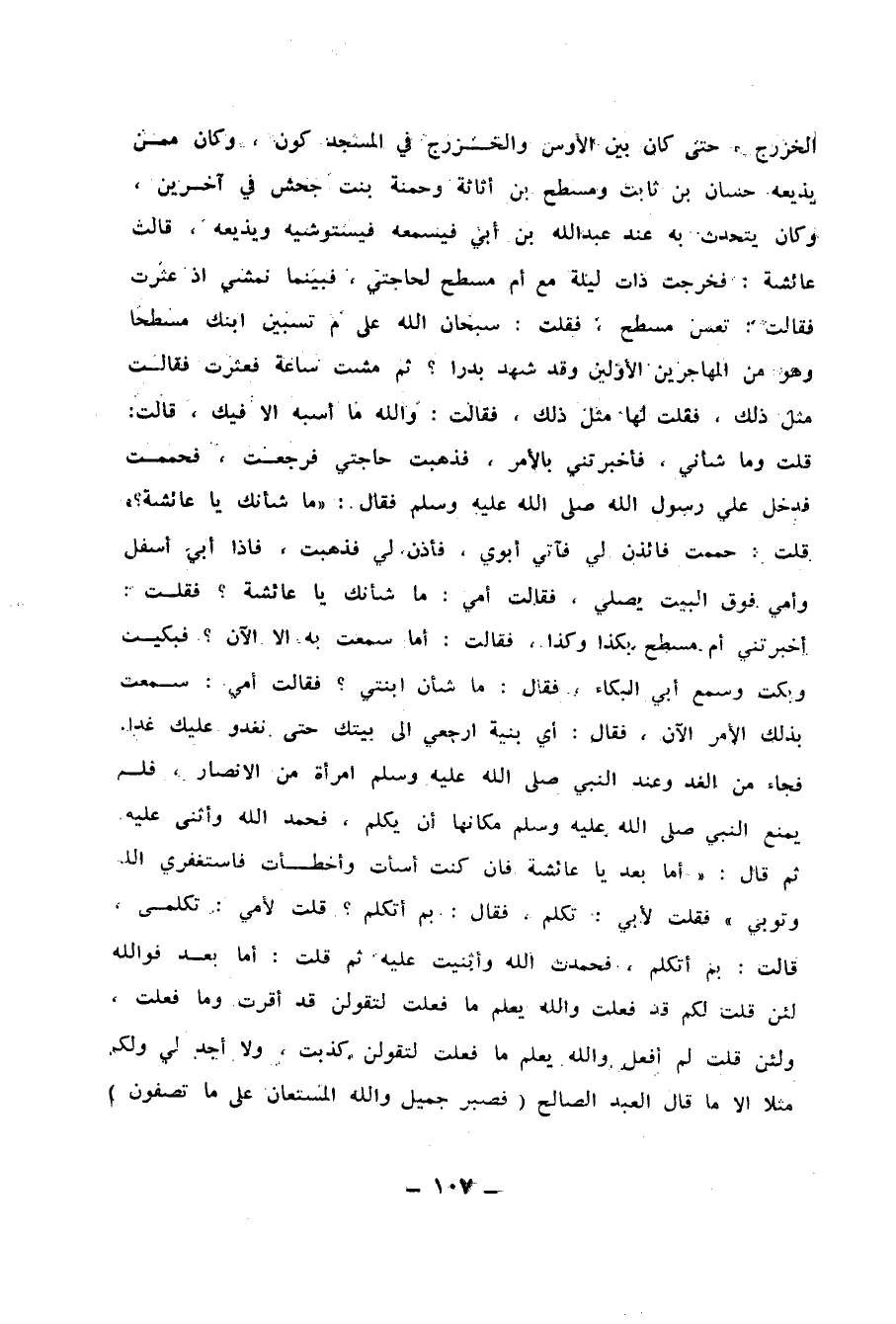 حَتَّى كَانَ بَيْنَ الأَوْسِ وَالْخَزْرَجِ فِي الْمَسْجِدِ كَوْنٌ وَكَانَ مِمَّنْ يَذِيعُهُ حَسَّانُ بْنُ ثَابِتٍ ، وَمِسْطَحُ بْنُ أُثَاثَةَ ، وَحَمْنَةُ بِنْتُ جَحْشٍ فِي آخَرِينَ ، وَكَانَ يَتَحَدَّثُ بِهِ عِنْدَ عَبْدِ اللهِ بْنِ أُبَيٍّ فَيَسْمَعُهُ فَيَسْتَوْشِيهِ وَيَذِيعُهُ ، قَالَتْ عَائِشَةُ : فَخَرَجْتُ ذَاتَ لَيْلَةٍ مَعَ أُمِّ مِسْطَحٍ لِحَاجَتِي ، فَبَيْنَمَا نَمْشِي إِذْ عَثَرَتْ ، فَقَالَتْ تَعِسَ مِسْطَحٌ ، فَقُلْتُ : سُبْحَانَ اللهِ عَلَى منَ تَسُبِّينَ ابْنَكِ مِسْطَحًا وَهُوَ مِنَ الْمُهَاجِرِينَ الأَوَّلِينَ وَقَدْ شَهِدَ بَدْرًا ؟ ثُمَّ مَشَتْ سَاعَةً فَعَثَرَتْ ، فَقَالَتْ مِثْلَ ذَلِكَ ، فَقُلْتُ لَهَا مِثْلَ ذَلِكَ ، فَقَالَتْ : وَاللَّهِ مَا أَسُبُّهُ إِلاَّ فِيكِ ، قَالَتْ : قُلْتُ : وَمَا شَأْنِي ؟ فَأَخْبَرَتْنِي بِالأَمْرِ ، فَذَهَبْتُ حَاجَتِي فَرَجَعْتُ ، فَحُمِمْتُ ، فَدَخَلَ رَسُولُ اللهِ صَلَّى اللَّهُ عَلَيْهِ وَسَلَّمَ ، فَقَالَ : مَا شَأْنُكِ يَا عَائِشَةُ ؟ قُلْتُ : حُمَمَةٌ فَائْذَنْ لِي فَآتِي أَبَوَيَّ ، فَأَذِنَ لِي فَذَهَبْتُ ، فَإِذَا أُمِّي أَسْفَلُ وَأَبِي فَوْقَ الْبَيْتِ يُصَلِّي ، فَقَالَتْ أُمِّي : مَا شَأْنُكِ يَا عَائِشَةُ ؟ فَقُلْتُ : أَخْبَرَتْنِي أُمُّ مِسْطَحٍ بِكَذَا وَكَذَا ، فَقَالَتْ : أَمَا سَمِعْتِ بِهِ إِلاَّ الآنَ ؟ فَبَكَيْتُ وَبَكَتْ وَسَمِعَ أَبِي الْبُكَاءَ ، فَقَالَ : مَا شَأْنُ ابْنَتِي ؟ فَقَالَتْ أُمِّي : سَمِعَتْ بِذَلِكَ الأَمْرِ الآنَ ، فَقَالَ : أَيْ بُنَيَّةُ ارْجِعِي إِلَى بَيْتِكِ حَتَّى نَغْدُوَ عَلَيْكِ غَدًا ، فَجَاءَ مِنَ الْغَدِ وَعِنْدَ النَّبِيِّ صَلَّى اللَّهُ عَلَيْهِ وَسَلَّمَ امْرَأَةٌ مِنَ الأَنْصَارِ ،