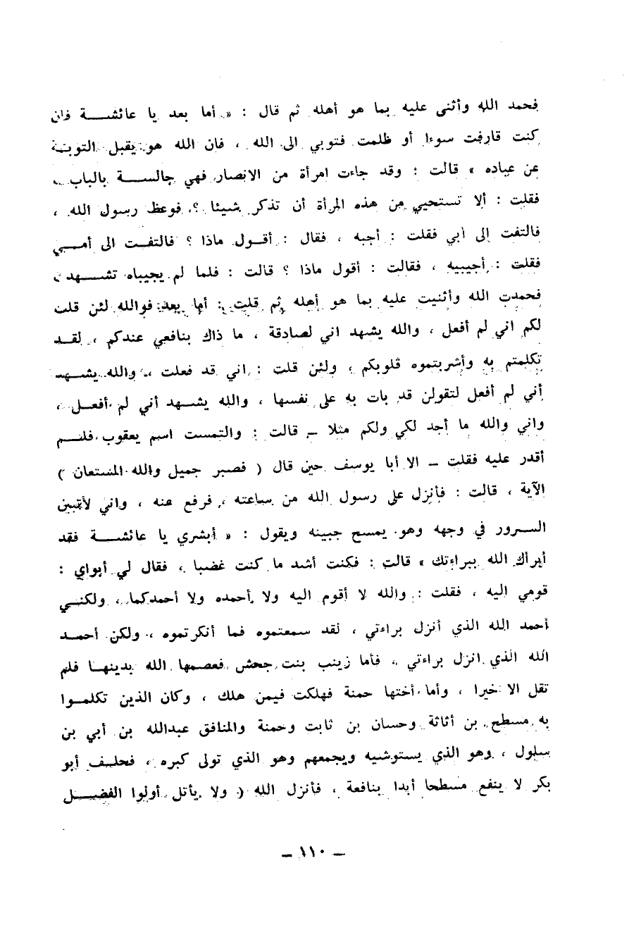 فَتَشَهَّدَ النَّبِيُّ صَلَّى اللَّهُ عَلَيْهِ وَسَلَّمَ فَحَمِدَ اللَّهَ وَأَثْنَى عَلَيْهِ بِمَا هُوَ أَهْلُهُ ، ثُمَّ قَالَ : أَمَّا بَعْدُ ، يَا عَائِشَةُ فَإِنْ كُنْتِ قَارَفْتِ سُوءًا ، أَوْ ظَلَمْتِ فَتُوبِي إِلَى اللهِ ، فَإِنَّ اللَّهَ هُوَ يَقْبَلُ التَّوْبَةَ عَنْ عِبَادِهِ ، قَالَتْ : وَقَدْ جَاءَتِ امْرَأَةٌ مِنَ الأَنْصَارِ فَهِيَ جَالِسَةٌ بِالْبَابِ ، فَقُلْتُ : أَلاَ تَسْتَحْي مِنْ هَذِهِ الْمَرْأَةِ أَنْ تَذْكُرَ شَيْئًا ، فَوَعَظَ رَسُولُ اللهِ فَالْتَفَتُّ إِلَى أَبِي ، فَقُلْتُ : أَجِبْهُ ، فَقَالَ : أَقُولُ مَاذَا ؟ فَالْتَفَتُّ إِلَى أُمِّي ، فَقُلْتُ : أَجِيبِيهِ ، فَقَالَتْ : أَقُولُ مَاذَا ؟ قَالَتْ : فَلَمَّا لَمْ يُجِيبَاهُ تَشَهَّدْتُ فَحَمِدْتُ اللَّهَ وَأَثْنَيْتُ عَلَيْهِ بِمَا هُوَ أَهْلُهُ ، ثُمَّ قُلْتُ : أَمَّا بَعْدُ ، فَوَاللَّهِ لَئِنْ قُلْتُ لَكُمْ إِنِّي لَمْ أَفْعَلْ وَاللَّهُ يَشْهَدُ أَنِّي لَصَادِقَةٌ مَا ذَاكَ بِنَافِعِي عِنْدَكُمْ ، لَقَدْ تَكَلَّمْتُمْ بِهِ وَأَشْرَبْتُمُوهُ قُلُوبَكُمْ ، وَلَئِنْ قُلْتُ إِنِّي قَدْ فَعَلْتُ وَاللَّهُ يَشْهَدُ أَنِّي لَمْ أَفْعَلْ لَتَقُولُنَّ قَدْ بَاتَ بِهِ عَلَى نَفْسِهَا وَاللَّهُ يَشْهَدُ أَنِّي لَمْ أَفْعَلْ ، وَإِنِّي وَاللَّهِ مَا أَجِدُ لِي وَلَكُمْ مَثَلاً ، قَالَتْ : وَالْتَمَسْتُ اسْمَ يَعْقُوبَ فَلَمْ أَقْدِرْ عَلَيْهِ ، فَقُلْتُ : إِلاَّ أَبَا يُوسُفَ حِينَ قَالَ : {فَصَبَرٌ جَمِيلٌ وَاللَّهُ الْمُسْتَعَانُ} الآيَةَ ، قَالَتْ : فَأُنْزِلَ عَلَى رَسُولِ اللهِ مِنْ سَاعَتِهِ فَرُفِعَ عَنْهُ ، وَإِنِّي لأَتَبَيَّنُ السُّرُورَ فِي وَجْهِهِ ، وَهُوَ يَمْسَحُ جَبِينَهُ وَيَقُولُ : أَبْشِرِي يَا عَائِشَةُ فَقَدْ أَبْرَأَكِ اللَّهُ بِبَرَاءَتِكِ ، قَالَتْ : فَكُنْتُ أَشَدَّ مَا كُنْتُ غَضَبًا ، فَقَالَ لِي أَبَوَايَ : قَوْمِي إِلَيْهِ ، فَقُلْتُ : وَاللَّهِ لاَ أَقُومُ إِلَيْهِ وَلاَ أَحْمَدُهُ وَلاَ أَحْمَدُكُمَا ، وَلَكِنِّي أَحْمَدُ اللَّهَ الَّذِي أَنْزَلَ بَرَاءَتِي لَقَدْ سَمِعْتُمُوهُ فَمَا أَنْكَرْتُمُوهُ ، وَلَكِنْ أَحْمَدُ اللَّهَ الَّذِي أَنْزَلَ بَرَاءَتِي ، فَأَمَّا زَيْنَبُ بِنْتُ جَحْشٍ فَعَصَمَهَا اللَّهُ بِدِينِهَا ، فَلَمْ تَقُلْ إِلاَّ خَيْرًا ، وَأَمَّا أُخْتُهَا حَمْنَةُ فَهَلَكَتْ فِيمَنْ هَلَكَ ، وَكَانَ الَّذِينَ تَكَلَّمُوا بِهِ مِسْطَحَ بْنَ أُثَاثَةَ وَحَسَّانَ بْنَ ثَابِتٍ وَحَمْنَةَ وَالْمُنَافِقَ عَبْدَ اللهِ بْنَ أُبَيٍّ ابْنِ سَلُولَ وَهُوَ الَّذِي يَسْتَوْشِيهِ وَيَجْمَعُهُمْ ، وَهُوَ الَّذِي تَوَلَّى كِبْرَهُ ، فَحَلَفَ أَبُو بَكْرٍ لاَ يَنْفَعُ مِسْطَحًا أَبَدًا بِنَافِعَةٍ ، فَأَنْزَلَ اللَّهُ {وَلاَ يَأْتَلِ أُولُو الْفَضْلِ مِنْكُمْ وَالسَّعَةِ} - يَعْنِي : أَبَا بَكْرٍ ، {أَنْ يُؤْتُوا أُولِي الْقُرْبَى وَالْمَسَاكِينَ} - يَعْنِي : مِسْطَحًا ، {أَلاَ تُحِبُّونَ أَنْ يَغْفِرَ اللَّهُ لَكُمْ وَاللَّهُ غَفُورٌ رَحِيمٌ} فَقَالَ أَبُو بَكْرٍ : بَلَى وَاللَّهِ يَا رَبِّ إِنَّا لَنُحِبُّ أَنْ يُغْفَرَ لَنَا فَعَادَ لِمَا كَانَ يَنْفَعُهُ بِهِ.