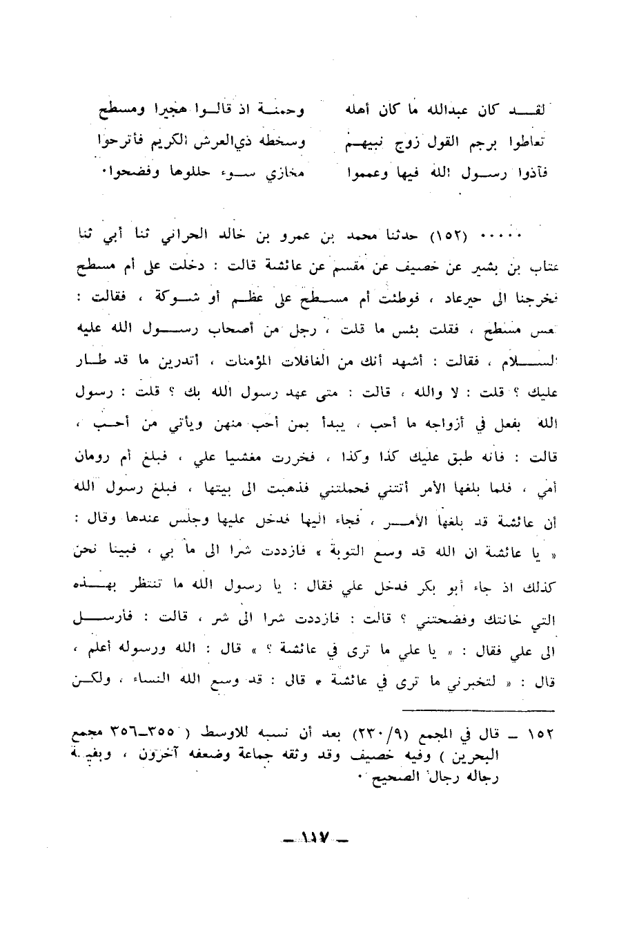 152 - حَدَّثَنَا مُحَمَّدُ بْنُ عَمْرِو بْنِ خَالِدٍ الْحَرَّانِيُّ، ثنا أَبِي، ثنا عَتَّابُ بْنُ بَشِيرٍ، عَنْ خُصَيْفٍ، عَنْ مِقْسَمٍ، عَنْ عَائِشَةَ، قَالَتْ: دَخَلَتْ عَلَيَّ أُمُّ مِسْطَحٍ فَخَرَجْنَا إِلَى حَيْرِ عَادٍ، فَوَطِئَتْ أُمُّ مِسْطَحٍ عَلَى عَظْمٍ أَوْ شَوْكَةٍ، فَقَالَتْ: تَعِسَ مِسْطَحٌ، فَقُلْتُ: بِئْسَ مَا قُلْتِ، رَجُلٌ مِنْ أَصْحَابِ رَسُولِ اللهِ عَلَيْهِ السَّلَامُ، فَقَالَتْ: أَشْهَدُ أَنَّكِ مِنَ الْغَافِلَاتِ الْمُؤْمِنَاتِ، أَتَدْرِينَ مَا قَدْ طَارَ عَلَيْكِ؟، قُلْتُ: لَا وَاللهِ، قَالَتْ: مَتَى عَهْدُ رَسُولِ اللهِ بِكِ؟، قُلْتُ: رَسُولُ اللهِ يَفْعَلُ فِي أَزْوَاجِهِ مَا أَحَبَّ، يَبْدَأُ بِمَنْ أَحَبَّ مِنْهُنَّ وَيَأْتِي مَنْ أَحَبَّ، قَالَتْ: فَإِنَّهُ طَبَّقَ عَلَيْكِ كَذَا وَكَذَا، فَخَرَرْتُ مَغْشِيًّا عَلَيَّ، فَبَلَغَ أُمَّ رُومَانَ أُمِّي، فَلَمَّا بَلَغَهَا الْأَمْرُ أَتَتْنِي فَحَمَلَتْنِي فَذَهَبَتْ إِلَى بَيْتِهَا، فَبَلَغَ رَسُولَ اللهِ أَنَّ عَائِشَةَ قَدْ بَلَغَهَا الْأَمْرُ، فَجَاءَ إِلَيْهَا فَدَخَلَ عَلَيْهَا وَجَلَسَ عِنْدَهَا وَقَالَ: «يَا عَائِشَةُ إِنَّ اللهَ قَدْ وَسَّعَ التَّوْبَةَ» ، فَازْدَدْتُ شَرًّا إِلَى مَا بِي، فَبَيْنَا نَحْنُ كَذَلِكَ إِذْ جَاءَ أَبُو بَكْرٍ فَدَخَلَ عَلَيَّ، فَقَالَ: يَا رَسُولَ اللهِ مَا تَنْتَظِرُ بِهَذِهِ الَّتِي خَانَتْكَ وَفَضَحَتْنِي، قَالَتْ: فَازْدَدْتُ شَرًّا إِلَى شَرٍّ، قَالَتْ: فَأَرْسَلَ إِلَى عَلِيٍّ فَقَالَ: «يَا عَلِيُّ مَا تَرَى فِي عَائِشَةَ؟» ، قَالَ: اللهُ وَرَسُولُهُ أَعْلَمُ، قَالَ: «لَتُخْبِرَنِّي مَا تَرَى فِي عَائِشَةَ» ، قَالَ: قَدْ وَسَّعَ اللهُ النِّسَاءَ، وَلَكِنْ أَرْسِلْ إِلَى بَرِيرَةَ خَادِمَتِهَا فَسَلْهَا، فَعَسَى أَنْ تَكُونَ قَدِ اطَّلَعَتْ عَلَى شَيْءٍ مِنْ أَمْرِهَا، فَأَرْسَلَ إِلَى بَرِيرَةَ فَجَاءَتْ فَقَالَ لَهَا: «أَتَشْهَدِينَ أَنِّي رَسُولُ اللهِ؟» ، قَالَتْ: نَعَمْ، قَالَ: «فَإِنِّي سَائِلُكِ عَنْ شَيْءٍ فَلَا تَكْتُمِينِي» ، قَالَتْ: نَعَمْ يَا رَسُولَ اللهِ، مَا مِنْ شَيْءٍ تَسْأَلُنِي عَنْهُ إِلَّا أَخْبَرْتُكَ بِهِ، وَلَا أَكْتُمُكَ إِنْ شَاءَ اللهُ شَيْئًا، قَالَ: «قَدْ كُنْتِ عِنْدَ عَائِشَةَ، فَهَلْ رَأَيْتِ مِنْهَا مَا تَكْرَهِينَهُ؟» ، قَالَتْ: لَا، وَالَّذِي بَعَثَكَ بِالنُّبُوَّةِ مَا رَأَيْتُ مِنْهَا مُذُّ كُنْتُ عِنْدَهَا إِلَّا خَلَّةً، قَالَ: «وَمَا هِيَ؟» ، قَالَتْ: عَجَنْتُ عَجِينًا لِي فَقُلْتُ لِعَائِشَةَ: احْفَظِي هَذِهِ الْعَجِينَةَ حَتَّى اقْتَبِسَ نَارًا فَأَخْبِزَ، فَقَامَتْ تُصَلِّي، فَغَفَلَتْ عَنِ الْخَمِيرِ فَجَاءَتْ شَاةٌ فَأَكَلَتْهَا، فَأَرْسَلَ إِلَى أُسَامَةَ فَقَالَ: «يَا أُسَامَةُ مَا تَرَى فِي عَائِشَةَ؟» ، قَالَ: اللهُ وَرَسُولُهُ أَعْلَمُ، قَالَ: «لَتُخْبِرَنِّي بِمَا تَرَى فِيهَا» ، قَالَ: فَإِنِّي أَرَى أَنْ تُمْسِكَ فِيهَا حَتَّى يُحْدِثَ اللهُ إِلَيْكَ فِيهَا، قَالَتْ: فَمَا كَانَ إِلَّا يَسِيرًا حَتَّى نَزَلَ الْوَحْيُ، فَلَمْ يَزَلْ يُرَى فِي وَجْهِ رَسُولِ اللهِ صَلَّى اللهُ عَلَيْهِ وَسَلَّمَ السُّرُورُ، وَجَاءَ عُذْرُهَا مِنَ السَّمَاءِ - يَعْنِي: مِنَ اللهِ - فَقَالَ رَسُولُ اللهِ: «§أَبْشِرِي يَا عَائِشَةُ، ثُمَّ أَبْشِرِي يَا عَائِشَةُ، فَقَدْ أَنْبَأَنِيَ اللهُ بِعُذْرِكِ» ، فَقُلْتُ: بِغَيْرِ حَمْدِكَ وَحَمْدِ صَاحِبِكَ، قَالَتْ: فَعِنْدَ ذَلِكَ تَكَلَّمْتُ، وَكَانَتْ إِذَا أَتَاهَا يَقُولُ: «كَيْفَ تِيكُمْ؟»