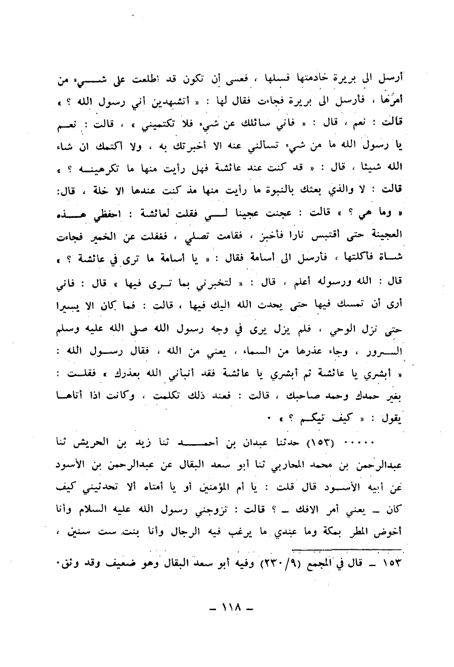 153 - حَدَّثَنَا عَبْدَانُ بْنُ أَحْمَدَ، ثنا زَيْدُ بْنُ الْحَرِيشِ، ثنا عَبْدُ الرَّحْمَنِ بْنُ مُحَمَّدٍ الْمُحَارِبِيُّ، ثنا أَبُو سَعْدٍ الْبَقَّالُ، عَنْ عَبْدِ الرَّحْمَنِ بْنِ الْأَسْوَدِ، عَنْ أَبِيهِ الْأَسْوَدِ، قَالَ: قُلْتُ: يَا أُمَّ الْمُؤْمِنِينَ، أَوْ يَا أُمَّتَاهُ أَلَا تُحَدِّثِينِي كَيْفَ كَانَ - يَعْنِي: أَمْرُ الْإِفْكِ؟ -، قَالَتْ: تَزَوَّجَنِي رَسُولُ اللهِ عَلَيْهِ السَّلَامُ وَأَنَا أَخُوضُ الْمَطَرَ بِمَكَّةَ، وَمَا عِنْدِي مَا يَرْغَبُ فِيهِ الرِّجَالُ وَأَنَا بِنْتُ سِتِّ سِنِينَ -[119]-، فَلَمَّا بَلَغَنِي أَنَّهُ تَزَوَّجَنِي أَلْقَى الله عَلَيَّ الْحَيَاءَ، ثُمَّ أَنَّ رَسُولَ اللهِ عَلَيْهِ السَّلَامُ هَاجَرَ وَأَنَا مَعَهُ، فَاحْتُمِلْتُ إِلَيْهِ وَقَدْ جَاءَنِي وَأَنَا بِنْتُ تِسْعِ سِنِينَ، فَسَارَ رَسُولُ اللهِ مَسِيرًا فَخَرَجَ بِي مَعَهُ، وَكُنْتُ خَفِيفَةً فِي حَدَجَةٍ لِي عَلَيْهَا سُتُورٌ، فَإِذَا ارْتَحَلُوا جَلَسْتُ عَلَيْهَا وَاحْتَمَلُوا وَأَنَا فِيهَا، فَشَدُّوهَا عَلَى ظَهْرِ الْبَعِيرِ فَنَزَلُوا مَنْزِلًا وَخَرَجْتُ لِحَاجَتِي، فَرَجَعْتُ وَقَدْ بَادَرُوا بِالرَّحِيلِ، فَجَلَسْتُ فِي الْحَدَاجَةِ وَقَدْ رَأَوْنِي حِينَ حَرَّكْتُ السُّتُورَ، فَلَمَّا جَلَسْتُ فِيهَا ضَرَبْتُ بِيَدِي عَلَى صَدْرِي فَإِذَا قَدْ نَسِيتُ قِلَادَةً كَانَتْ مَعِي، فَخَرَجْتُ مُسْرِعَةً أَطْلُبُهَا، فَرَجَعْتُ فَإِذَا الْقَوْمُ قَدْ سَارُوا فَإِذَا أَنَا لَا أَرَى إِلَّا الْغُبَارَ مِنْ بَعِيدٍ، فَإِذَا هُمْ قَدْ وَضَعُوا الْحَدَاجَةَ عَلَى ظَهْرِ الْبَعِيرِ لَا يَرَوْنِي إِلَّا أَنِّي فِيهَا لِمَا رَأَوْا مِنْ خِفَّتِي، فَإِذَا رَجُلٌ آخِذٌ بِرَأْسِ بَعِيرِهِ، فَقُلْتُ: مَنِ الرَّجُلُ؟، قَالَ: صَفْوَانُ بْنُ الْمُعَطَّلِ السُّلَمِيُّ، أُمُّ الْمُؤْمِنِينَ أَنْتِ؟، قُلْتُ: نَعَمْ، قَالَ: إِنَّا لِلَّهِ وَإِنَّا إِلَيْهِ رَاجِعُونَ، قُلْتُ: أَدِرْ عَنِّي وَجْهَكَ وَضَعْ رِجْلَكَ عَلَى ذِرَاعِ بَعِيرِكَ، قَالَ: أَفْعَلُ وَنُعْمَةُ عَيْنٍ وَكَرَامَةٌ، قَالَتْ: فَأَدْرَكْتُ النَّاسَ حِينَ نَزَلُوا، فَذَهَبَ فَوَضَعَنِي عِنْدَ الْحَدَاجَةِ، فَنَظَرَ إِلَيَّ النَّاسُ وَلَا أَشْعُرُ، قَالَتْ: وَأَنْكَرْتُ لُطْفَ أَبَوَيَّ وَأَنْكَرْتُ رَسُولَ اللهِ وَلَا أَعْلَمُ مَا قَدْ كَانَ قِيلَ حَتَّى دَخَلَتْ خَادِمَتِي أَوْ رَبِيبَتِي فَقَالَتْ: كَذَا، قَالَتْ: وَقَالَ لِي رَجُلٌ مِنَ الْمُهَاجِرِينَ: مَا أَغْفَلَكِ؟، فَأَخَذَتْنِي حُمَّى نَافِضٌ، فَأَخَذَتْ أُمِّي كُلَّ ثَوْبٍ فِي الْبَيْتِ فَأَلْقَتْهُ عَلَيَّ، فَاسْتَشَارَ رَسُولُ اللهِ أُنَاسًا مِنْ أَصْحَابِهِ، فَقَالَ: «مَا تَرَوْنَ؟» ، فَقَالَ بَعْضُهُمْ: مَا أَكْثَرَ النِّسَاءِ وَتَقْدِرُ عَلَى الْبَدَلِ، وَقَالَ بَعْضُهُمْ: أَنْتَ رَسُولُ اللهِ وَعَلَيْكَ يَنْزِلُ الْوَحْيُ وَأَمْرُنَا لِأَمْرِكَ تَبَعٌ، وَقَالَ بَعْضُهُمْ: وَاللهِ لَيُبَيِّنُنَّهُ اللهُ فَلَا تَعْجَلْ، قَالَتْ: وَقَدْ صَارَ وَجْهُ أَبِي كَأَنَّهُ صُبَّ عَلَيْهِ الزِّرْنِيخُ، قَالَتْ: فَدَخَلَ عَلَيَّ رَسُولُ اللهِ فَرَأَى مَا بِي، قَالَ: «مَا لِهَذِهِ؟» ، قَالَتْ أُمِّي: مِمَّا لِهَذِهِ مِمَّا قُلْتُمْ وَقِيلَ، فَلَمْ يَتَكَلَّمْ وَلَمْ يَقُلْ شَيْئًا، قَالَتْ: فَزَادَنِي ذَلِكَ عَلَى مَا عِنْدِي، قَالَتْ: وَأَتَانِي فَقَالَ: «اتَّقِي اللهَ يَا عَائِشَةُ، وَإِنْ كُنْتِ قَارَفْتِ مِنْ هَذَا شَيْئًا فَتُوبِي إِلَى اللهِ، فَإِنَّ اللهَ يَقْبَلُ التَّوْبَةَ عَنْ عِبَادِهِ وَيَعْفُو عَنِ السَّيِّئَاتِ» ، قَالَتْ: وَطَلَبْتُ اسْمَ يَعْقُوبَ فَلَمْ أَقْدِرْ عَلَيْهِ، فَقُلْتُ: غَيْرَ أَنِّي أَقُولُ كَمَا قَالَ أَبُو يُوسُفَ {