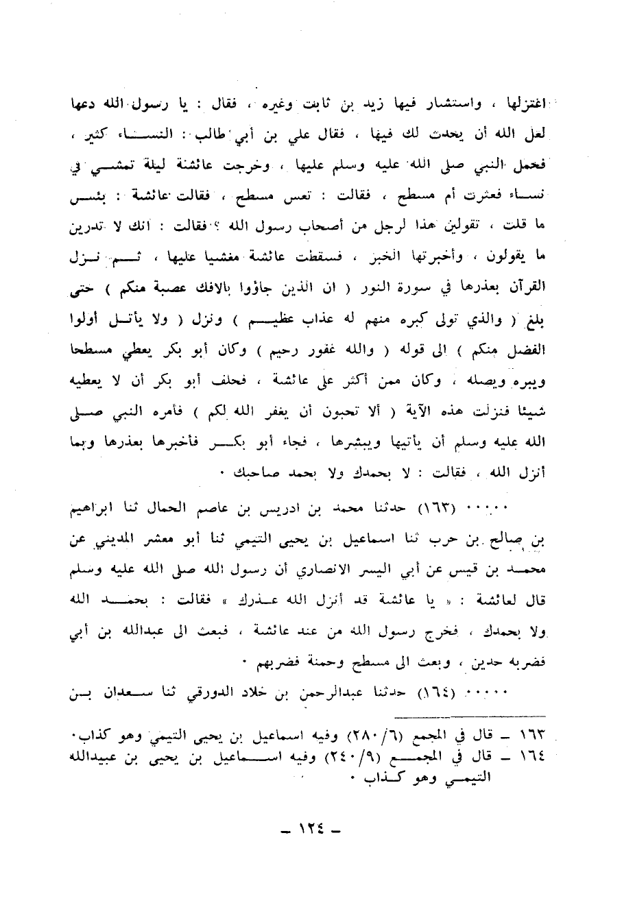 163 - حَدَّثَنَا مُحَمَّدُ بْنُ إِدْرِيسَ بْنِ عَاصِمٍ الْجَمَّالُ، ثنا إِبْرَاهِيمُ بْنُ صَالِحِ بْنِ حَرْبٍ، ثنا إِسْمَاعِيلُ بْنُ يَحْيَى التَّيْمِيُّ، ثنا أَبُو مَعْشَرٍ الْمَدِينِيُّ، عَنْ مُحَمَّدِ بْنِ قَيْسٍ، عَنْ أَبِي الْيَسَرِ الْأَنْصَارِيِّ، أَنَّ رَسُولَ اللهِ صَلَّى اللهُ عَلَيْهِ وَسَلَّمَ قَالَ لِعَائِشَةَ: «§يَا عَائِشَةُ قَدْ أَنْزَلَ اللهُ عُذْرَكِ» ، فَقَالَتْ: بِحَمْدِ اللهِ وَلَا بِحَمْدِكَ، فَخَرَجَ رَسُولُ اللهِ مِنْ عِنْدِ عَائِشَةَ فَبَعَثَ إِلَى عَبْدِ اللهِ بْنِ أُبَيٍّ فَضَرَبَهُ حَدَّيْنِ، وَبَعَثَ إِلَى مِسْطَحٍ، وَحَمْنَةَ فَضَرَبَهُمْ