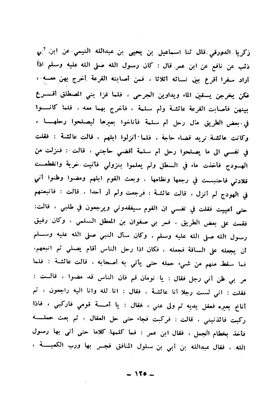 164 - حَدَّثَنَا عَبْدُ الرَّحْمَنِ بْنُ خَلَّادٍ الدَّوْرَقِيُّ، ثنا سَعْدَانُ بْنُ زَكَرِيَّا الدَّوْرَقِيُّ، قَالَ: ثنا إِسْمَاعِيلُ بْنُ يَحْيَى بْنِ عَبْدِ اللهِ التَّيْمِيُّ، عَنِ ابْنِ أَبِي ذِئْبٍ، عَنْ نَافِعٍ، عَنِ ابْنِ عُمَرَ، قَالَ: كَانَ رَسُولُ اللهِ صَلَّى اللهُ عَلَيْهِ وَسَلَّمَ §إِذَا أَرَادَ سَفَرًا أَقْرَعَ بَيْنَ نِسَائِهِ أَثْلَاثًا، فَمَنْ أَصَابَتْهُ الْقُرْعَةُ أَخْرَجَ بِهِنَّ مَعَهُ، فَكُنَّ يَخْرُجْنَ يَسْقِينَ الْمَاءَ وَيُدَاوِينَ الْجَرْحَى، فَلَمَّا غَزَا بَنِي الْمُصْطَلِقِ أَقْرَعَ بَيْنَهُنَّ فَأَصَابَتِ الْقُرْعَةُ عَائِشَةَ وَأُمَّ سَلَمَةَ، فَأَخْرَجَ بِهِمَا مَعَهُ، فَلَمَّا كَانُوا فِي بَعْضِ الطَّرِيقِ مَالَ رَحْلُ أُمِّ سَلَمَةَ فَأَنَاخُوا بَعِيرَهَا لِيُصْلِحُوا رَحْلَهَا، وَكَانَتْ عَائِشَةُ تُرِيدُ قَضَاءَ حَاجَةٍ، فَلَمَّا أَنْزَلُوا إِبِلَهُمْ، قَالَتْ عَائِشَةُ: فَقُلْتُ فِي نَفْسِي إِلَى مَا يُصْلِحُوا رَحْلَ أُمِّ سَلَمَةَ أَقْضِي حَاجَتِي، قَالَتْ: فَنَزَلْتُ مِنَ الْهَوْدَجِ فَأَخَذْتُ مَاءً فِي السَّطْلِ وَلَمْ يَعْلَمُوا بِنُزُولِي فَأَتَيْتُ خَرِبَةً وَانْقَطَعَتْ قِلَادَتِي، فَاحْتَبَسْتُ فِي رَجْعِهَا وَنِظَامِهَا، وَبَعَثَ الْقَوْمُ إِبِلَهُمْ وَمَضَوْا، وَظَنُّوا أَنِّي فِي الْهَوْدَجِ لَمْ أَنْزَلْ، قَالَتْ عَائِشَةُ: فَرَجَعْتُ وَلَمْ أَرَ أَحَدًا، قَالَتْ: فَاتَّبَعْتُهُمْ حَتَّى أُعْيِيتُ فَقُلْتُ فِي نَفْسِي: إِنَّ الْقَوْمَ سَيَفْقِدُونِي وَيَرْجِعُونَ فِي طَلَبِي، قَالَتْ: فَقُمْتُ عَلَى بَعْضِ الطَّرِيقِ، فَمَرَّ بِي صَفْوَانُ بْنُ الْمُعَطَّلِ السُّلَمِيُّ، وَكَانَ رَفِيقَ رَسُولِ اللهِ صَلَّى اللهُ عَلَيْهِ وَسَلَّمَ، وَكَانَ سَأَلَ النَّبِيَّ صَلَّى اللهُ عَلَيْهِ وَسَلَّمَ أَنْ يَجْعَلَهُ عَلَى السَّاقَةِ فَجَعَلَهُ، فَكَانَ إِذَا رَحَلَ النَّاسُ أَقَامَ يُصَلِّي ثُمَّ اتَّبَعَهُمْ، فَمَا سَقَطَ مِنْهُمْ مِنْ شَيْءٍ حَمَلَهُ حَتَّى يَأْتِيَ بِهِ أَصْحَابَهُ، قَالَتْ عَائِشَةُ: فَلَمَّا مَرَّ بِي ظَنَّ أَنِّي رَجُلٌ، فَقَالَ: يَا نَوْمَانُ قُمْ فَإِنَّ النَّاسَ قَدْ مَضَوْا، قَالَتْ: فَقُلْتُ: إِنِّي لَسْتُ رَجُلًا أَنَا عَائِشَةُ، فَقَالَ: إِنَّ لِلَّهِ وَإِنَّا إِلَيْهِ رَاجِعُونَ، ثُمَّ أَنَاخَ بَعِيرَهُ فَعَقَلَ يَدَيْهِ ثُمَّ وَلَّى عَنِّي، فَقَالَ: يَا أُمَّةَ قَوْمِي فَارْكَبِي، فَإِذَا رَكِبْتِ فَآذِنِينِي، قَالَتْ: فَرَكِبْتُ فَجَاءَ حَتَّى حَلَّ الْعِقَالَ، ثُمَّ بَعَثَ حِمْلَهُ فَأَخَذَ بِخِطَامِ الْجَمَلِ، فَقَالَ ابْنُ عُمَرَ: فَمَا كَلَّمَهَا كَلَامًا حَتَّى أَتَى بِهَا رَسُولَ اللهِ، فَقَالَ عَبْدُ اللهِ بْنُ أُبَيٍّ ابْنِ سَلُولَ الْمُنَافِقُ فَجَرَ بِهَا وَرَبِّ الْكَعْبَةِ -[126]-، وَأَعَانَهُ عَلَى ذَلِكَ حَسَّانُ بْنُ ثَابِتٍ الْأَنْصَارِيَّ وَمِسْطَحُ بْنُ أُثَاثَةَ، وَحَمْنَةُ، وَشاعَ ذَلِكَ فِي الْعَسْكَرِ، وَبَلَغَ ذَلِكَ النَّبِيَّ صَلَّى اللهُ عَلَيْهِ وَسَلَّمَ، وَكَانَ فِي قَلْبِ النَّبِيِّ صَلَّى اللهُ عَلَيْهِ وَسَلَّمَ مِمَا قَالُوا، حَتَّى رَجَعُوا إِلَى الْمَدِينَةِ، وَأَشَاعَ عَبْدُ اللهِ بْنُ أُبَيِّ بْنِ سَلُولٍ هَذَا الْحَدِيثَ فِي الْمَدِينَةِ، وَاشْتَدَّ ذَلِكَ عَلَى رَسُولِ اللهِ صَلَّى اللهُ عَلَيْهِ وَسَلَّمَ، قَالَتْ عَائِشَةُ: فَدَخَلَتْ ذَاتَ يَوْمٍ أُمُّ مِسْطَحٍ فَرَأَتْنِي وَأَنَا أُرِيدُ الْمَذْهَبَ فَحَمَلَتْ مَعِي السَّطْلَ وَفِيهِ مَاءٌ، فَوَقَعَ السَّطْلُ مِنْهَا، فَقَالَتْ: تَعِسَ مِسْطَحٌ، قَالَتْ لَهَا عَائِشَةُ: سُبْحَانَ اللهِ، تُتْعِسِينَ رَجُلًا مِنْ أَهْلِ بَدْرٍ وَهُوَ ابْنُكِ؟، قَالَتْ لَهَا أُمُّ مِسْطَحٍ: إِنَّه