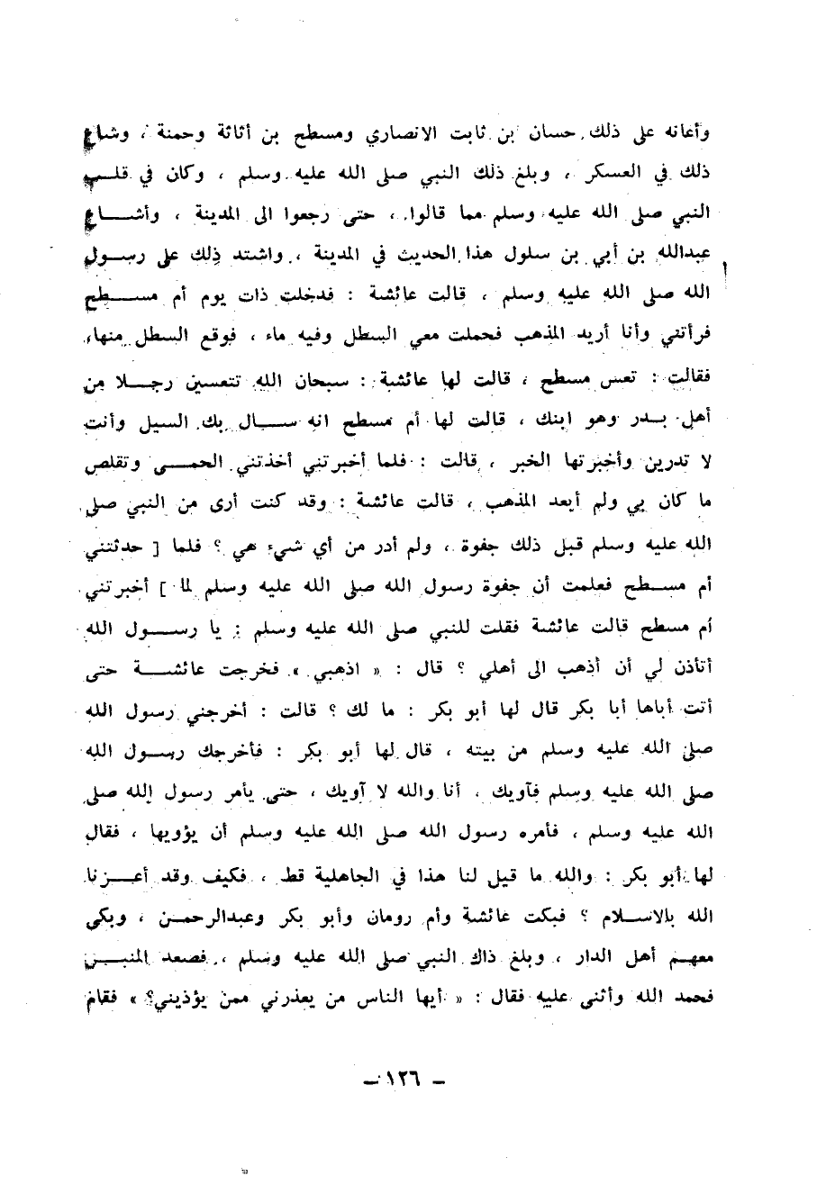 قَالَتْ عَائِشَةُ : وَقَدْ كُنْتُ أَرَى مِنَ النَّبِيِّ صَلَّى اللَّهُ عَلَيْهِ وَسَلَّمَ قَبْلَ ذَلِكَ جَفْوَةً ، وَلَمْ أَدْرِ مِنْ أَيِّ شَيْءٍ هِيَ ؟ فَلَمَّا حَدَّثَتْنِي أُمُّ مِسْطَحٍ فَعَلِمْتُ أَنَّ جَفْوَةَ رَسُولِ اللهِ صَلَّى اللَّهُ عَلَيْهِ وَسَلَّمَ كَانَتْ لِمَا أَخْبَرَتْنِي أُمُّ مِسْطَحٍ ، قَالَتْ عَائِشَةُ : فَقُلْتُ لِلنَّبِيِّ صَلَّى اللَّهُ عَلَيْهِ وَسَلَّمَ : يَا رَسُولَ اللهِ أَتَأْذَنُ لِي أَنْ أَذْهَبَ إِلَى أَهْلِي ؟ قَالَ : اذْهَبِي ، فَخَرَجَتْ عَائِشَةُ حَتَّى أَتَتْ أَبَاهَا أَبَا بَكْرٍ ، قَالَ لَهَا أَبُو بَكْرٍ : مَا لَكِ ؟ قَالَتْ : أَخْرَجَنِي رَسُولُ اللهِ صَلَّى اللَّهُ عَلَيْهِ وَسَلَّمَ مِنْ بَيْتِهِ ، قَالَ لَهَا أَبُو بَكْرٍ : فَأَخْرَجَكِ رَسُولُ اللهِ صَلَّى اللَّهُ عَلَيْهِ وَسَلَّمَ فَآوِيكِ أَنَا وَاللَّهِ لاَ آوِيكِ حَتَّى يَأْمُرَ رَسُولُ اللهِ صَلَّى اللَّهُ عَلَيْهِ وَسَلَّمَ ، فَأَمَرَهُ رَسُولُ اللهِ صَلَّى اللَّهُ عَلَيْهِ وَسَلَّمَ أَنْ يُؤْوِيَهَا ، فَقَالَ لَهَا أَبُو بَكْرٍ : وَاللَّهِ مَا قِيلَ لَنَا هَذَا فِي الْجَاهِلِيَّةِ قَطُّ ، فَكَيْفَ وَقَدْ أَعَزَّنَا اللَّهُ بِالإِسْلاَمِ ؟ فَبَكَتْ عَائِشَةُ وَأُمُّهَا أُمُّ رُومَانَ وَأَبُو بَكْرٍ وَعَبْدُ الرَّحْمَنِ ، وَبَكَى مَعَهُمْ أَهْلُ الدَّارِ ، وَبَلَغَ ذَاكَ النَّبِيَّ صَلَّى اللَّهُ عَلَيْهِ وَسَلَّمَ ، فَصَعِدَ الْمِنْبَرَ فَحَمِدَ اللَّهَ وَأَثْنَى عَلَيْهِ ، فَقَالَ : أَيُّهَا النَّاسُ مَنْ يَعْذُرُنِي مِمَّنْ يُؤْذِينِي ؟ ، فَقَامَ إِلَيْهِ سَعْدُ بْنُ مُعَاذٍ فَسَلَّ سَيْفَهُ ، فَقَالَ : يَا رَسُولَ اللهِ أَنَا أَعْذُرُكَ مِنْهُ ، إِنْ يَكَ مِنَ الأَوْسِ أَتَيْتُكَ بِرَأْسِهِ ، وَإِنْ يَكُ مِنَ الْخَزْرَجِ أَمَرْتَنَا بِأَمْرِكَ فِيهِ ، فَقَامَ سَعْدُ بْنُ عُبَادَةَ ، فَقَالَ : كَذَبْتَ ، وَاللَّهِ مَا تَقْدِرُ عَلَى قَتْلِهِ إِنَّمَا طَلَبْتَنَا بِدُخُولٍ كَانَتْ بَيْنَنَا وَبَيْنَكُمْ فِي الْجَاهِلِيَّةِ ، فَقَالَ هَذَا : يَا لَلأَوْسِ ، وَقَالَ هَذَا : يَا لَلْخَزْرَجِ ، فَاضْطَرَبُوا بِالنِّعَالِ وَالْحِجَارَةِ وَتَلاَطَمُوا ،