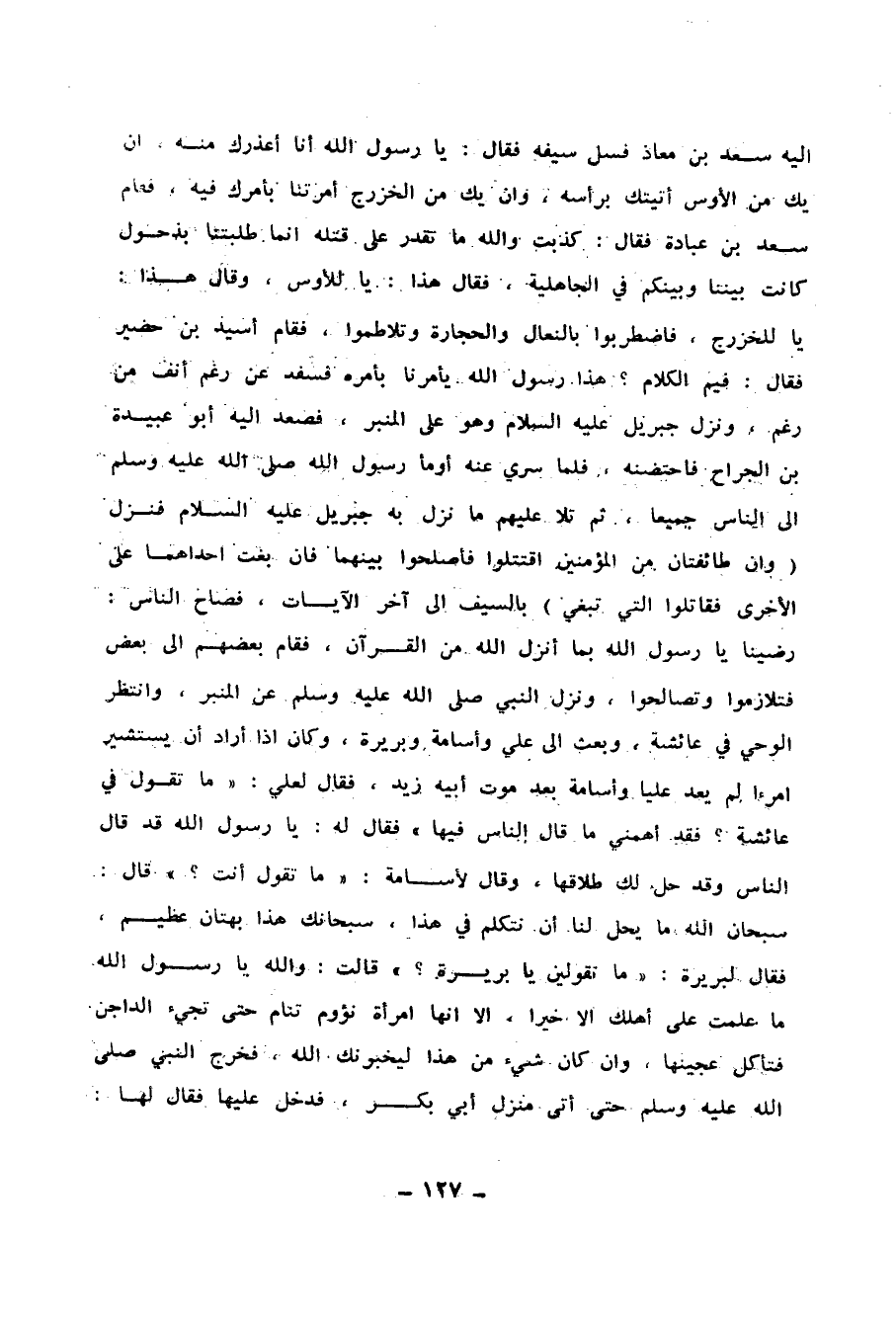 فَقَامَ أُسَيْدُ بْنُ حُضَيْرٍ ، فَقَالَ : فِيمَ الْكَلاَمُ ؟ هَذَا رَسُولُ اللهِ يَأْمُرُنَا بِأَمْرِهِ فَسَفَدَ عَنْ رَغْمِ أَنْفِ مَنْ رَغِمَ ، وَنَزَلَ جِبْرِيلُ عَلَيْهِ السَّلاَمُ وَهُوَ عَلَى الْمِنْبَرِ ، فَصَعِدَ إِلَيْهِ أَبُو عُبَيْدَةَ بْنُ الْجَرَّاحِ فَاحْتَضَنَهُ ، فَلَمَّا سُرِّيَ عَنْهُ أَوْمَأَ رَسُولُ اللهِ صَلَّى اللَّهُ عَلَيْهِ وَسَلَّمَ إِلَى النَّاسِ جَمِيعًا ، ثُمَّ تَلاَ عَلَيْهِمْ مَا نَزَلَ بِهِ جِبْرِيلُ عَلَيْهِ السَّلاَمُ ، فَنَزَلَ {وَإِنْ طَائِفَتَانِ مِنَ الْمُؤْمِنِينَ اقْتَتَلُوا فَأَصْلِحُوا بَيْنَهُمَا فَإِنْ بَغَتْ إِحْدَاهُمَا عَلَى الأُخْرَى فَقَاتِلُوا الَّتِي تَبْغِي} بِالسَّيْفِ إِلَى آخِرِ الآيَاتِ ، فَصَاحَ النَّاسُ : رَضِينَا يَا رَسُولَ اللهِ بِمَا أَنْزَلَ اللَّهُ مِنَ الْقُرْآنِ ، فَقَامَ بَعْضُهُمْ إِلَى بَعْضٍ فَتَلاَزَمُوا وَتَصَالَحُوا ، وَنَزَلَ النَّبِيُّ صَلَّى اللَّهُ عَلَيْهِ وَسَلَّمَ عَنِ الْمِنْبَرِ ، وَانْتَظَرَ الْوَحْيَ فِي عَائِشَةَ ، وَبَعَثَ إِلَى عَلِيٍّ وَأُسَامَةَ وَبَرِيرَةَ ، وَكَانَ إِذَا أَرَادَ أَنْ يَسْتَشِيرَ امْرَءًا لَمْ يَعْدُ عَلِيًّا وَأُسَامَةَ بَعْدَ مَوْتِ أَبِيهِ زَيْدٍ ، فَقَالَ لِعَلِيٍّ : مَا تَقُولُ فِي عَائِشَةَ ؟ فَقَدْ أَهَمَّنِي مَا قَالَ النَّاسُ فِيهَا ، فَقَالَ لَهُ : يَا رَسُولَ اللهِ قَدْ قَالَ النَّاسُ وَقَدْ حَلَّ لَكَ طَلاَقُهَا ، وَقَالَ لأُسَامَةَ : مَا تَقُولُ أَنْتَ ؟ قَالَ : سُبْحَانَ اللهِ مَا يَحِلُّ لَنَا أَنْ نَتَكَلَّمَ بِهَذَا ، سُبْحَانَكَ هَذَا بُهْتَانٌ عَظِيمٌ ، فَقَالَ لِبَرِيرَةَ : مَا تَقُولِينَ يَا بَرِيرَةُ ؟ قَالَتْ : وَاللَّهِ يَا رَسُولَ اللهِ مَا عَلِمْتُ عَلَى أَهْلِكَ إِلاَّ خَيْرًا ، إِلاَّ أَنَّهَا امْرَأَةٌ نَؤُومٌ ، تَنَامُ حَتَّى تَجِيءَ الدَّاجِنُ فَتَأْكُلَ عَجِينَهَا ، وَإِنْ كَانَ شَيْءٌ مِنْ هَذَا لَيُخْبِرَنَّكَ اللَّهُ ، فَخَرَجَ النَّبِيُّ صَلَّى اللَّهُ عَلَيْهِ وَسَلَّمَ حَتَّى أَتَى مَنْزِلَ أَبِي بَكْرٍ ،