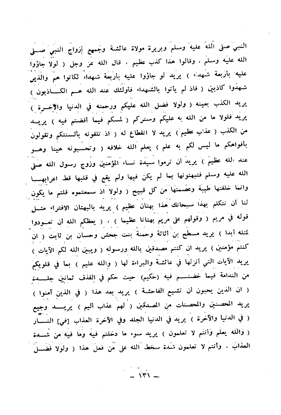 ، وَبَرِيرَةَ مَوْلاَةَ عَائِشَةَ ، وَجَمِيعَ أَزْوَاجِ النَّبِيِّ صَلَّى اللَّهُ عَلَيْهِ وَسَلَّمَ ، وَقَالُوا هَذَا كَذِبٌ عَظِيمٌ ، قَالَ اللَّهُ عَزَّ وَجَلَّ {لَوْلاَ جَاؤُوا عَلَيْهِ بِأَرْبَعَةِ شُهَدَاءَ} يُرِيدُ لَوْ جَاؤُوا عَلَيْهِ بِأَرْبَعَةِ شُهَدَاءَ لَكَانُوا هُمْ وَالَّذِينَ شَهِدُوا كَاذِبَيْنَ ، {فَإِذْ لَمْ يَأْتُوا بِالشُّهَدَاءِ فَأُولَئِكَ عِنْدَ اللهِ هُمُ الْكَاذِبُونَ} يُرِيدُ الْكَذِبَ بِعَيْنِهِ ، {وَلَوْلاَ فَضْلُ اللهِ عَلَيْكُمْ وَرَحْمَتُهُ فِي الدُّنْيَا وَالآخِرَةِ} يُرِيدُ فَلَوْلاَ مَا مَنَّ اللَّهُ بِهِ عَلَيْكُمْ وَسَتَرَكُمْ ، {لَمَسَّكُمْ فِي مَا أَفَضْتُمْ فِيهِ} يُرِيدُ مِنَ الْكَذِبِ ، {عَذَابٌ عَظِيمٌ} يُرِيدُ لاَ انْقِطَاعَ لَهُ ، {إِذْ تَلَقَّوْنَهُ بِأَلْسِنَتِكُمْ وَتَقُولُونَ بِأَفْوَاهِكُمْ مَا لَيْسَ لَكُمْ بِهِ عِلْمٌ} يَعْلَمُ اللَّهُ خِلاَفَهُ ، {وَتَحْسَبُونَهُ هَيِّنًا وَهُوَ عِنْدَ اللهِ عَظِيمٌ} يُرِيدُ أَنْ تَرْمُوا سَيِّدَةَ نِسَاءِ الْمُؤْمِنِينَ وَزَوْجَ رَسُولِ اللهِ صَلَّى اللَّهُ عَلَيْهِ وَسَلَّمَ فَتَبْهَتُونَهَا بِمَا لَمْ يَكُنْ فِيهَا وَلَمْ يَقَعْ فِي قَلْبِهَا قَطُّ إِعْرَابُهَا ، وَإِنَّمَا خَلَقْتُهَا طَيِّبَةً ، وَعَصَمْتُهَا مِنْ كُلِّ قَبِيحٍ ، {وَلَوْلاَ إِذْ سَمِعْتُمُوهُ قُلْتُمْ مَا يَكُونُ لَنَا أَنْ نَتَكَلَّمَ بِهَذَا سُبْحَانَكَ هَذَا بُهْتَانٌ عَظِيمٌ} يُرِيدُ بِالْبُهْتَانِ الاِفْتِرَاءَ ، مِثْلَ قَوْلِهِ فِي مَرْيَمَ {وَقَوْلُهُمْ عَلَى مَرْيَمَ بُهْتَانًا عَظِيمًا} {يَعِظُكُمُ اللَّهُ أَنْ تَعُودُوا لِمِثْلِهِ أَبَدًا} يُرِيدُ مِسْطَحَ بْنَ أُثَاثَةَ ، وَحَمْنَةَ بِنْتَ جَحْشٍ ، وَحَسَّانَ بْنَ ثَابِتٍ ، {إِنْ كُنْتُمْ مُؤْمِنِينَ} يُرِيدُ إِنْ كُنْتُمْ مُصَدِّقِينَ بِاللَّهِ وَرَسُولِهِ ، {وَيُبَيِّنُ اللَّهُ لَكُمُ الآيَاتِ} يُرِيدُ الآيَاتِ الَّتِي أَنْزَلَهَا فِي عَائِشَةَ ، وَالْبَرَاءَةَ لَهَا ، {وَاللَّهُ عَلِيمٌ} بِمَا فِي قُلُوبُكُمْ مِنَ النَّدَامَةِ فِيمَا خُضْتُمْ فِيهِ ، {حَكِيمٌ} حَيْثُ حَكَمَ فِي الْقَذْفِ ثَمَانِينَ جَلْدَةً ، {إِنَّ الَّذِينَ يُحِبُّونَ أَنْ تَشِيعَ الْفَاحِشَةُ} يُرِيدُ بَعْدَ هَذَا ، {فِي الَّذِينَ آمَنُوا} يُرِيدُ الْمُحْصَنِينَ وَ الْمُحْصَنَاتِ مِنَ الْمُصَدِّقِينَ ، {لَهُمْ عَذَابٌ أَلِيمٌ} يُرِيدُ وَجِيعٌ ، {فِي الدُّنْيَا وَالآخِرَةِ} يُرِيدُ فِي الدُّنْيَا الْجَلْدَ ، وَفِي الآخِرَةِ الْعَذَابَ فِي النَّارِ ، {وَاللَّهُ يَعْلَمُ وَأَنْتُمْ لاَ تَعْلَمُونَ} يُرِيدُ سُوءَ مَا دَخَلْتُمْ فِيهِ وَمَا فِيهِ مِنْ شِدَّةِ الْعَذَابِ ، وَأَنْتُمْ لاَ تَعْلَمُونَ شِدَّةَ سَخَطِ اللهِ عَلَى مَنْ فَعَلَ هَذَا ، {وَلَوْلاَ فَضْلُ اللهِ عَلَيْكُمْ وَرَحْمَتُهُ}.